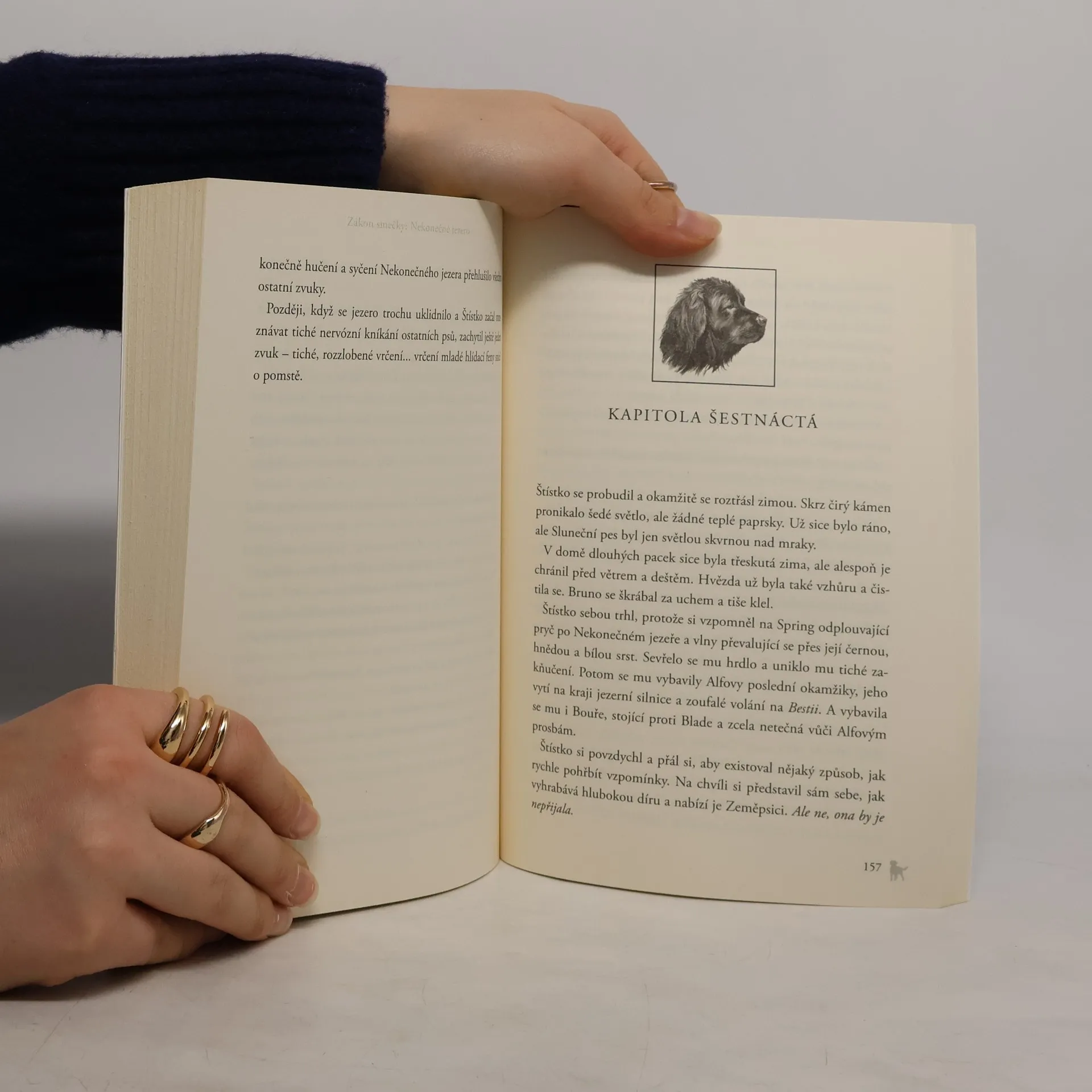 Pátý díl populární zvířecí ságy. Štístko a jeho smečka se dokázali ubránit Běsovi, nelítostnému vůdci cizí tlupy. Přesto nejsou v bezpečí. Jezero, ke kterému doputovali, se zdá být nekonečné a nelze v něm ulovit žádnou kořist. Zima se blíží a smečka prahne po jídle a suchém přístřeší. Alfa všem dává najevo, že jeho vlastní potřeby jsou nadřazené potřebám ostatních. A hlídací psi jim jsou v patách…
