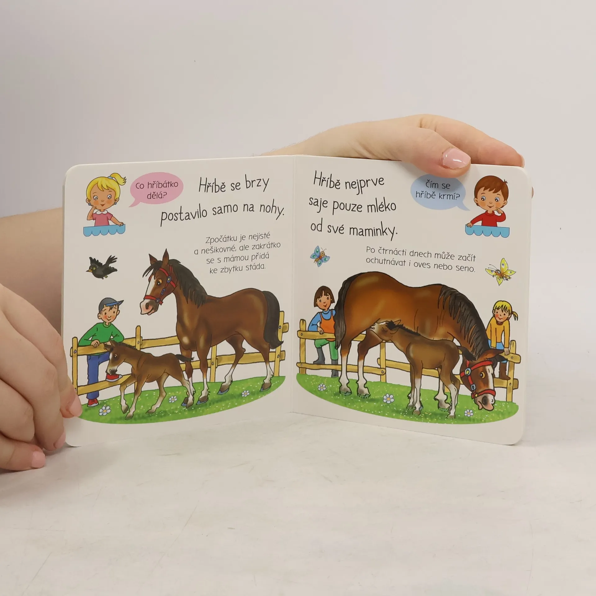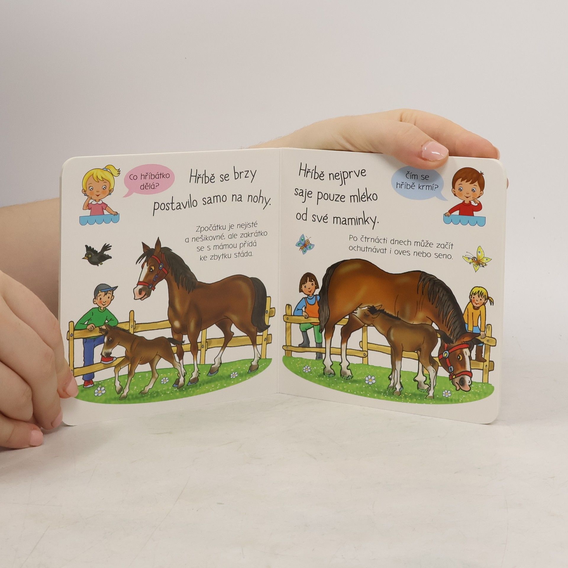Bohatě ilustrovaná knížka s krátkými texty dává nahlédnout do světa koní. Děti zjistí, jak se kobyly starají o hříbátka a co všechno chov koní obnáší.