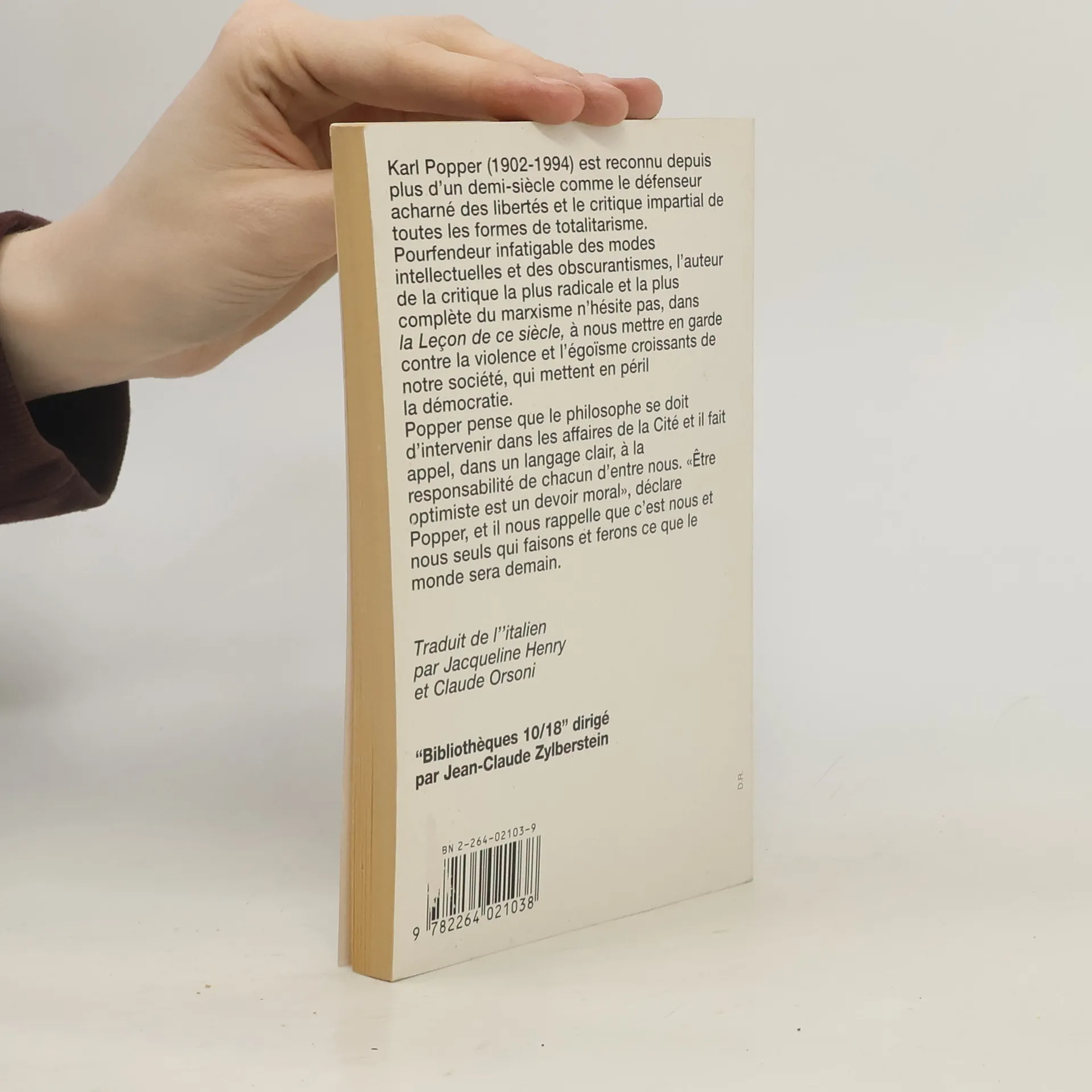 Karl Popper (1902-1994) est reconnu depuis plus d'un demi-siècle comme le défenseur acharné des libertés et le critique impartial de toutes les formes de totalitarisme. Pourfendeur infatigable des modes intellectuelles et des obscurantismes, l'auteur de la critique la plus radicale et la plus complète du marxisme n'hésite pas, dans la Leçon de ce siècle, à nous mettre en garde contre la violence et l'égoïsme croissants de notre société, qui mettent en péril la démocratie. Popper pense que le philosophe se doit d'intervenir dans les affaires de la Cité et il fait appel, dans un langage clair, à la responsabilité de chacun d'entre nous. " Etre optimiste est un devoir moral ", déclare Popper, et il nous rappelle que c'est nous et nous seuls qui faisons et ferons ce que le monde sera demain.