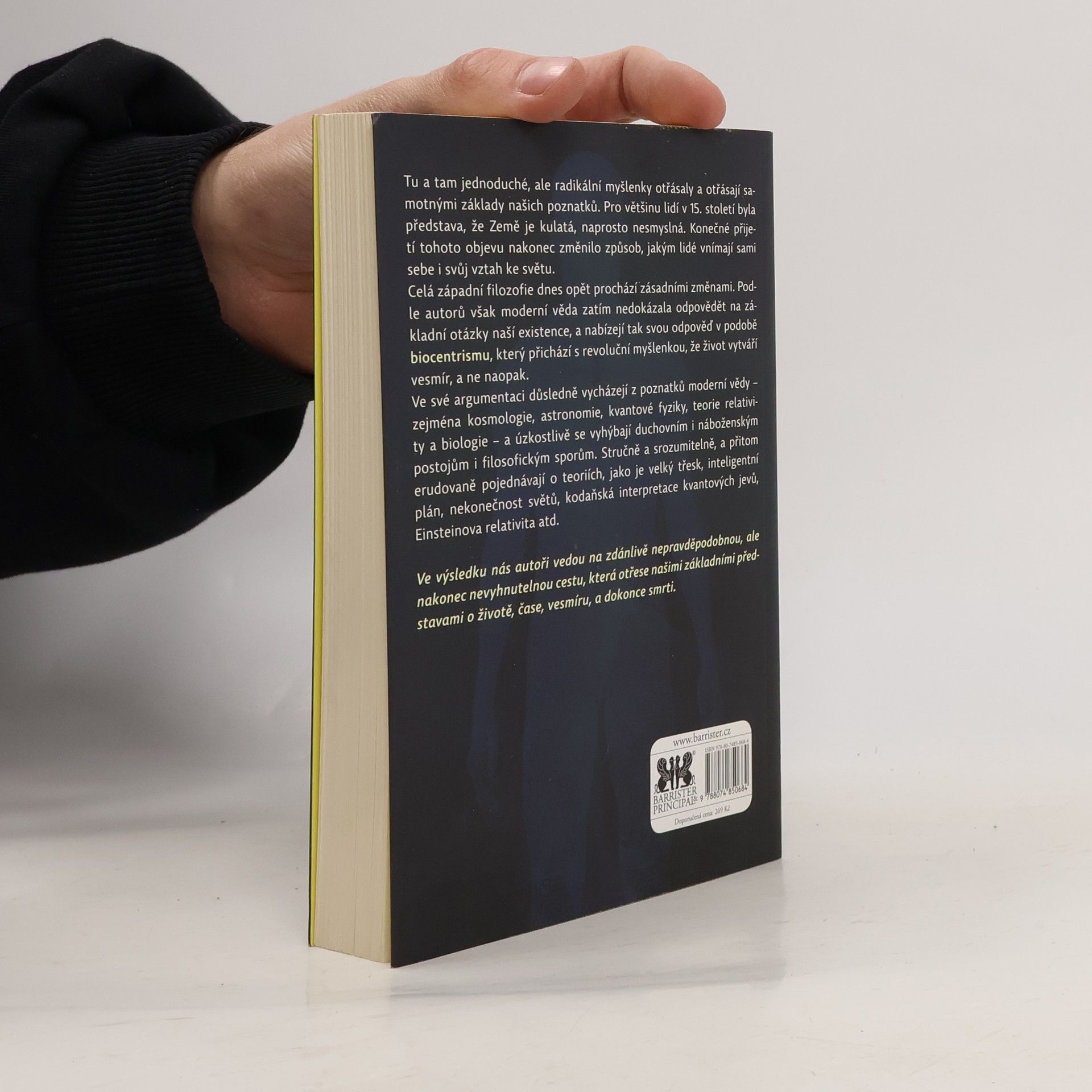 Kniha dvou známých amerických autorů, biologa Roberta Lanzy a astronoma Boba Bermana, přináší strhující pohled, který převrací naše dlouho zavedené názory na svět. Radikální myšlenky autorů, podobně jako kdysi představa kulaté Země, mění naše vnímání sebe sama a našeho vztahu k okolnímu světu. Moderní věda zatím nedokázala odpovědět na základní otázky existence, a tak autoři představují biocentrismus, který tvrdí, že život vytváří vesmír, nikoli naopak. Vycházejí z poznatků moderní vědy, jako jsou kosmologie, kvantová fyzika a teorie relativity, a vyhýbají se duchovním a náboženským postojům. Srozumitelně a erudovaně se zabývají teoriemi, jako je velký třesk či Einsteinova relativita. Realita, jak ji vnímáme, je proces spojený s naším vědomím; vnější a vnitřní vjemy jsou nerozlučně propojeny. Čas a prostor nejsou nezávislé entity, ale formy našeho vnímání. Autoři nás vedou na cestu, která otřese našimi základními představami o životě, čase, vesmíru a smrti.