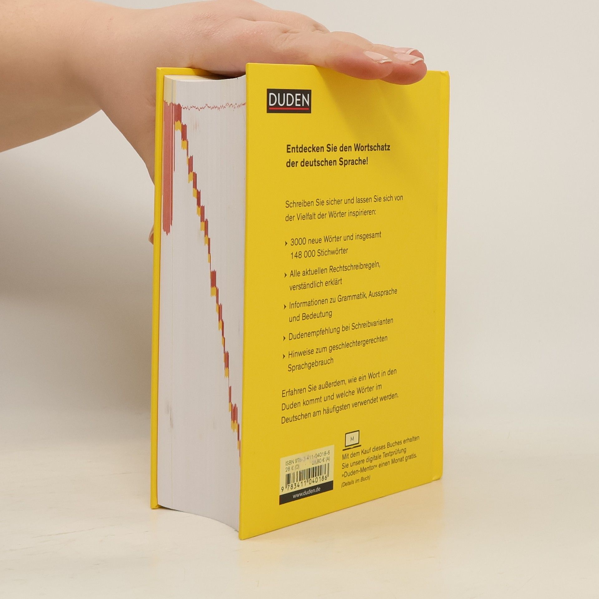 Entdecken Sie den Wortschatz der deutschen Sprache! Mit dem neuen Duden 2020: - Rund 148.000 Stichwörter, davon 3000 Neuaufnahmen- Informationen zu Grammatik, Aussprache, Bedeutung der Stichwörter- Mit der Dudenempfehlung, wenn mehrere Schreibvarianten möglich sind- Hilfe beim Lösen von Zweifelsfällen- Hinweise zum geschlechtergerechten Sprachgebrauch- Nach dem aktuellen Stand der Rechtschreibregelungen Zusätzlich erklären wir Rechtschreib- und Zeichensetzungsregeln, wie ein Text korrigiert wird, wie ein Wort in den Duden kommt, welche Wörter am häufigsten verwendet werden und vieles mehr. Schreiben Sie sicher und lassen Sie sich inspirieren von der Vielfalt der Wörter!