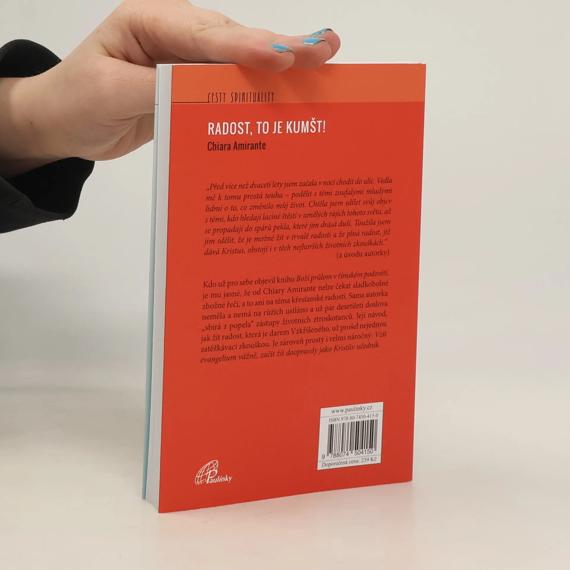 Autorka už pár desetiletí „sbírá z popela“ zástupy životních ztroskotanců. Její návod, jak žít z radosti Vzkříšeného, je zároveň prostý i velmi náročný: Vzít evangelium vážně, začít žít jako Kristův učedník. „Před více než dvaceti lety jsem začala v noci chodit do ulic. Vedla mě k tomu prostá touha – podělit s těmi zoufalými mladými lidmi o to, co změnilo můj život. Chtěla jsem sdílet svůj objev s těmi, kdo hledají laciné štěstí v umělých rájích tohoto světa, až se propadají do spárů pekla, které jim drásá duši. Toužila jsem jim sdělit, že je možné žít v trvalé radosti a že plná radost, již dává Kristus, obstojí i v těch nejhorších životních zkouškách.“ (z úvodu autorky) Kdo už pro sebe objevil knihu Boží průlom v římském podsvětí, je mu jasné, že od Chiary Amirante nelze čekat sladkobolné zbožné řeči, a to ani na téma křesťanské radosti. Sama autorka neměla a nemá na růžích ustláno a už pár desetiletí doslova „sbírá z popela“ zástupy životních ztroskotanců. Její návod, jak žít radost, která je darem Vzkříšeného, už prošel nejednou zatěžkávací zkouškou. Je zároveň prostý i velmi náročný: Vzít evangelium vážně, začít žít doopravdy jako Kristův učedník.