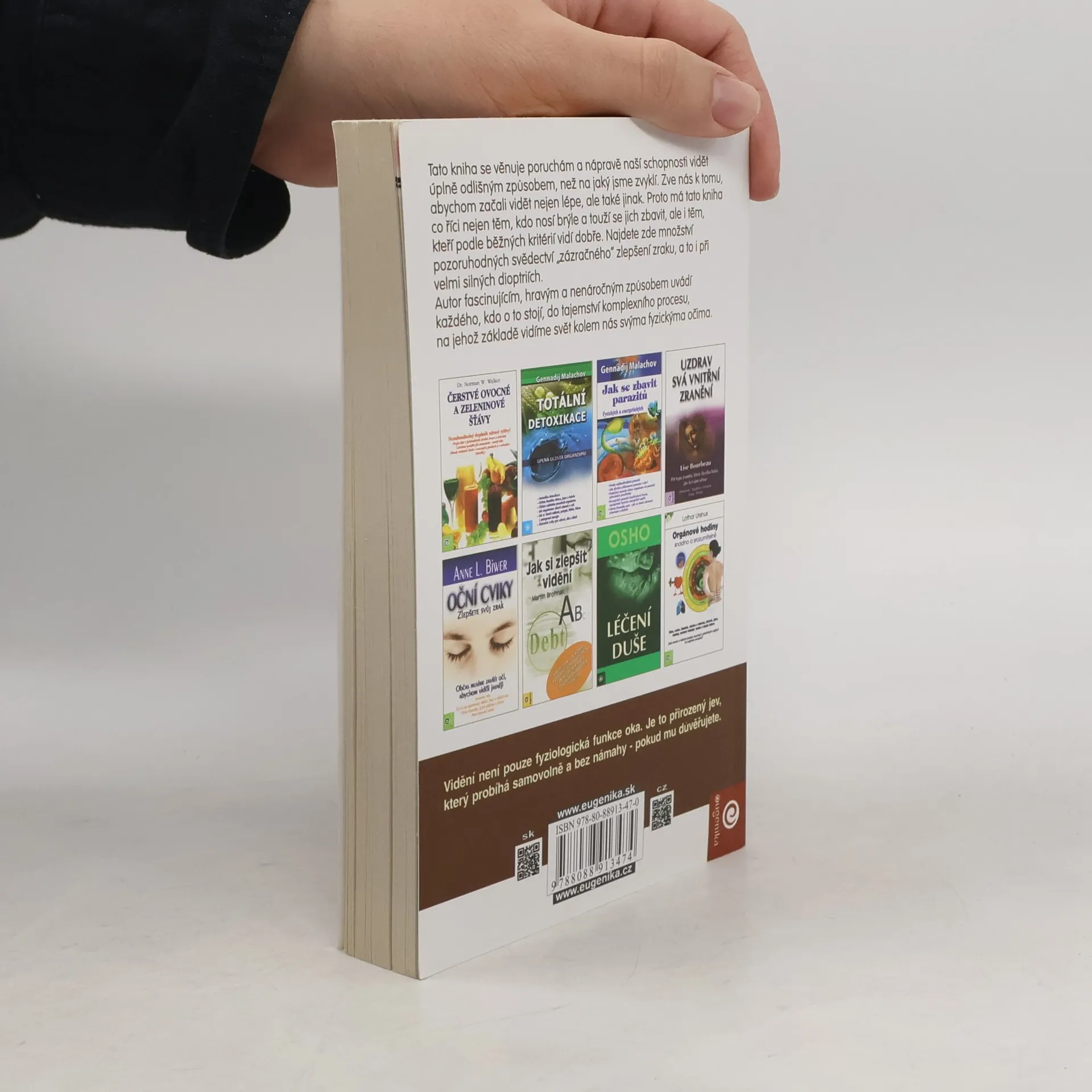 Tato kniha se věnuje poruchám a nápravě naší schopnosti vidět úplně odlišným způsobem, než na jaký jsme zvyklí. Zve nás k tomu, abychom začali vidět nejen lépe, ale také jinak. Proto má tato kniha co říci nejen těm, kdo nosí brýle a touží se jich zbavit, ale i těm, kteří podle běžných kritérií vidí dobře. Najdete zde množství pozoruhodných svědectví zázračného zlepšení zraku, a to i při velmi silných dioptriích.
