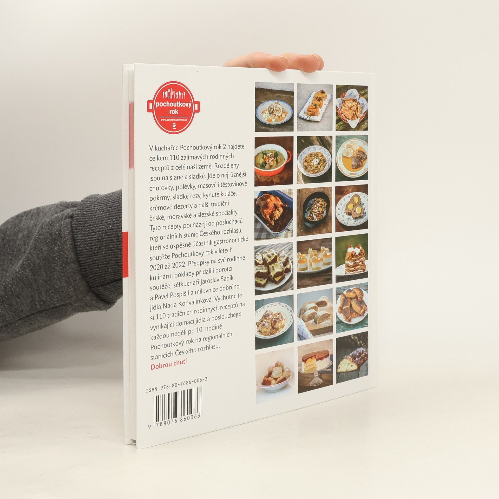 101 tradičních rodinných receptů na vynikající domácí jídla.V kuchařce Pochoutkový rok 2 najdete celkem 110 zajímavých rodinných receptů z celé naší země. Rozděleny jsou na slané a sladké. Jde o nejrůznější chuťovky, polévky, masové i těstovinové pokrmy, sladké řezy, kynuté koláče, krémové dezerty a další tradiční české, moravské a slezské speciality. Tyto recepty pocházejí od posluchačů regionálních stanic Českého rozhlasu, kteří se úspěšně účastnili gastronomické soutěže Pochoutkový rok v letech 2020 až 2022. Předpisy na své rodinné kulinární poklady přidali i porotci soutěže, šéfkuchaři Jaroslav Sapík a Pavel Pospíšil a milovnice dobrého jídla herečka Naďa Konvalinková. Vychutnejte si 110 tradičních rodinných receptů na vynikající domácí jídla a poslouchejte každou neděli po 10. hodině Pochoutkový rok na regionálních stanicích Českého rozhlasu. Dobrou chuť!