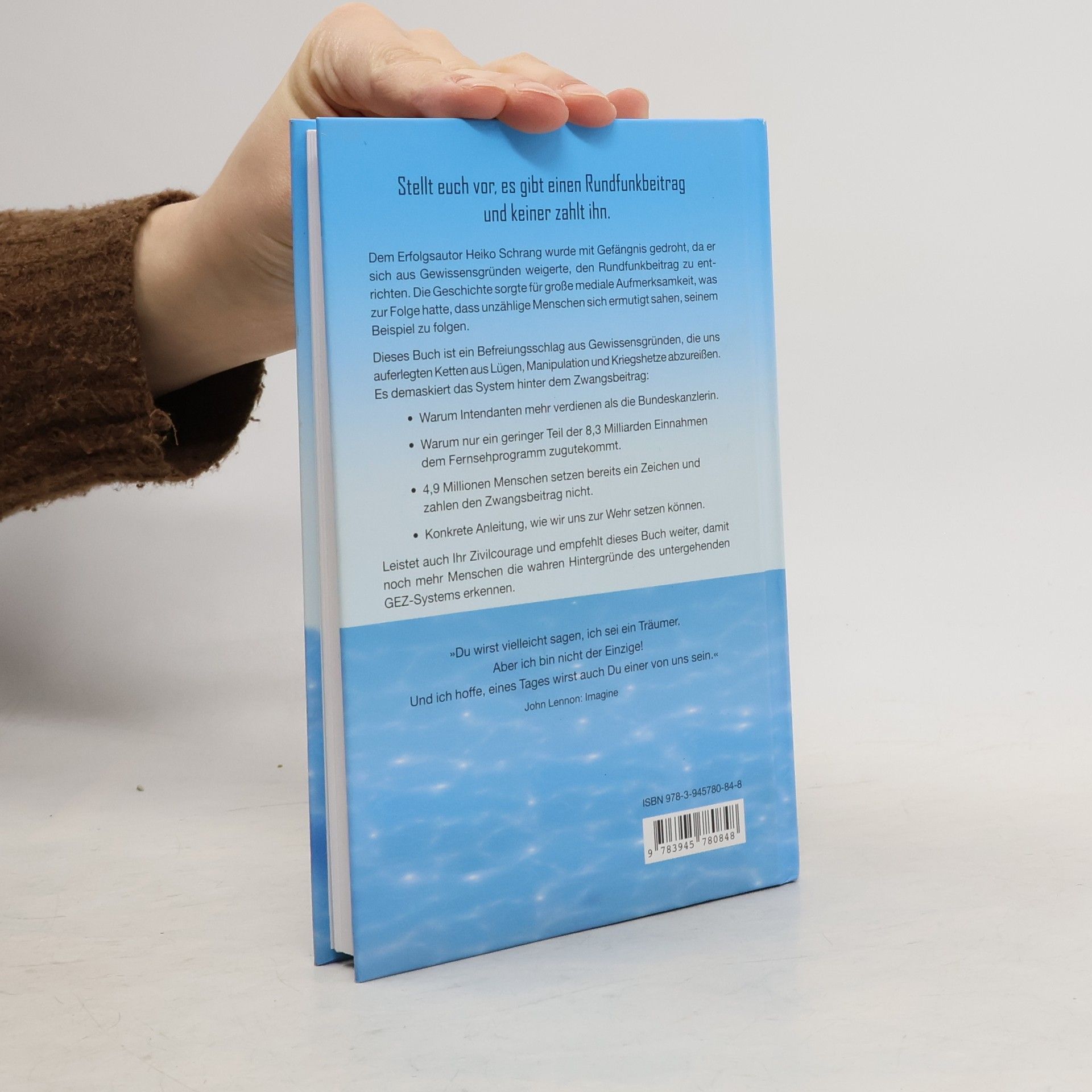Stellt euch vor, es gibt einen Rundfunkbeitrag und keiner zahlt ihn. Dem Erfolgsautor Heiko Schrang wurde mit Gefängnis gedroht, da er sich aus Gewissensgründen weigerte, den Rundfunkbeitrag zu entrichten. Die Geschichte sorgte für große mediale Aufmerksamkeit, was zur Folge hatte, dass unzählige Menschen sich ermutigt sahen, seinem Beispiel zu folgen. Dieses Buch ist ein Befreiungsschlag aus Gewissensgründen, die uns auferlegten Ketten aus Lügen, Manipulation und Kriegshetze abzureißen. Es demaskiert das System hinter dem Zwangsbeitrag: - Warum Intendanten mehr verdienen als die Bundeskanzlerin. - Warum nur ein geringer Teil der 8,3 Milliarden Einnahmen dem Fernsehprogramm zugutekommt. - 4,9 Millionen Menschen setzen bereits ein Zeichen und zahlen den Zwangsbeitrag nicht. - Konkrete Anleitung, wie wir uns zur Wehr setzen können. Leistet auch Ihr Zivilcourage und empfehlt dieses Buch weiter, damit noch mehr Menschen die wahren Hintergründe des untergehenden GEZ-Systems erkennen. „Du wirst vielleicht sagen, ich sei ein Träumer. Aber ich bin nicht der Einzige! Und ich hoffe, eines Tages wirst auch Du einer von uns sein.“ (John Lennon: Imagine) Dieses Buch ist ein Aufruf zur Zivilcourage!