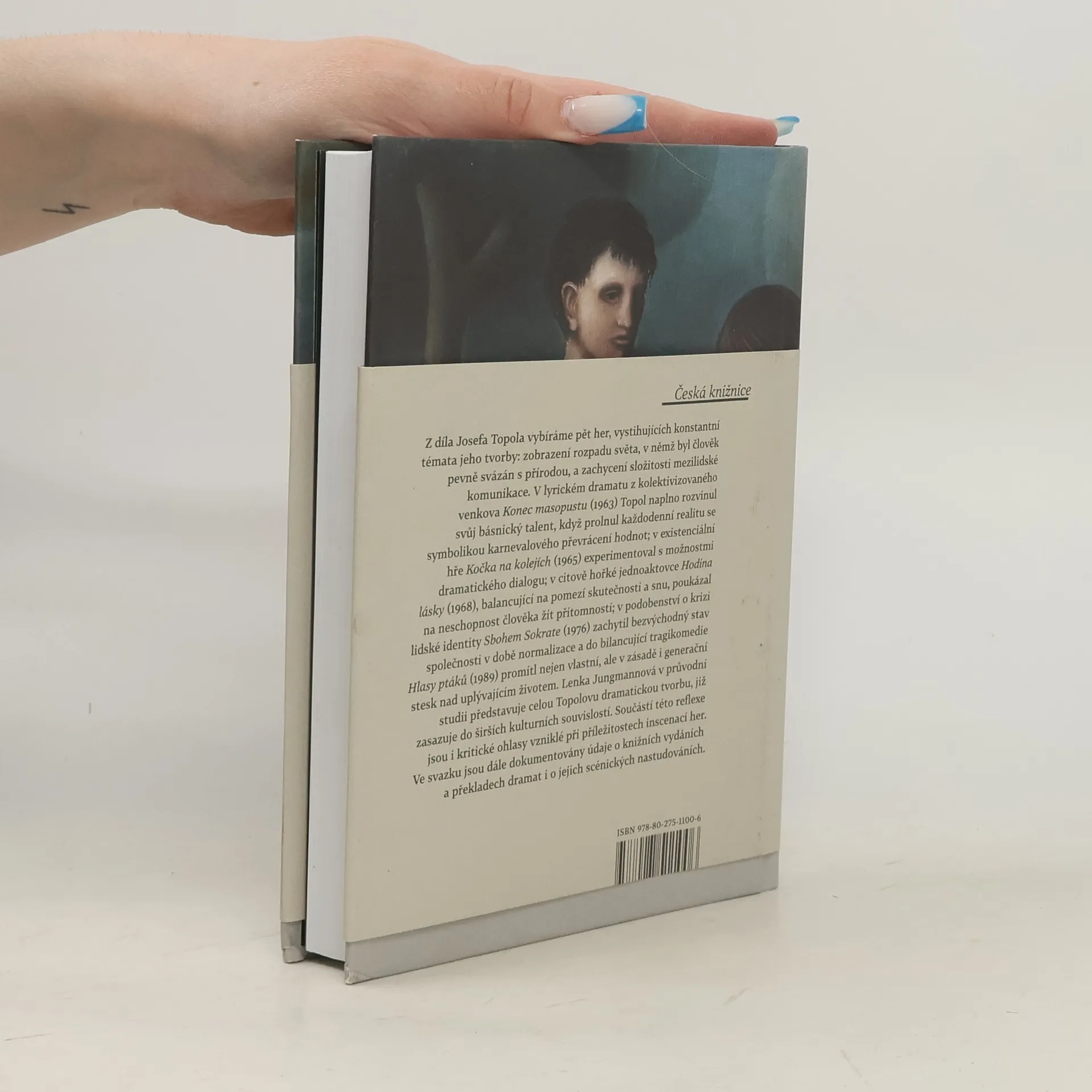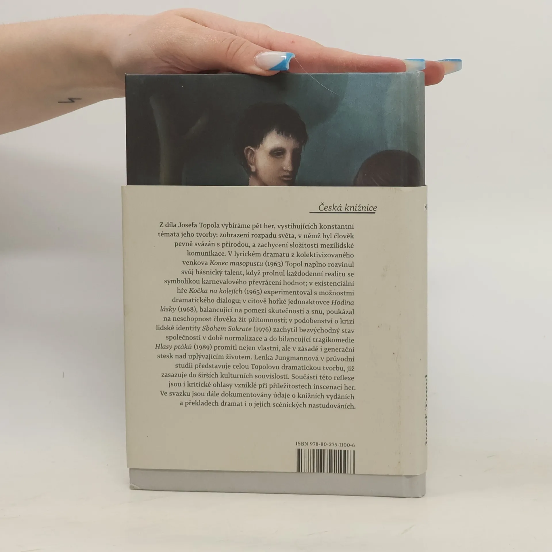 O ztrátě identity a etickém rozměru bytí. Svazek soustřeďuje průřezový výběr z celoživotní dramatické tvorby Josefa Topola (1935—2015), mimo jiné též zakládajícího člena Divadla za branou, signatáře Charty 77 a držitele literární Ceny Karla Čapka. Symbolické básnické drama z kolektivizovaného venkova Konec masopustu (1963), existenciální dialog Kočka na kolejích (1965), citově hořká jednoaktovka Hodina lásky (1968), podobenství o bezvýchodnosti života za normalizace Sbohem, Sokrate! (1975) a bilancující tragikomedie Hlasy ptáků (1989) vystihují konstantní témata Topolovy tvorby, k nimž patří úporné hledání pravdy, lásky a cesty k druhému.