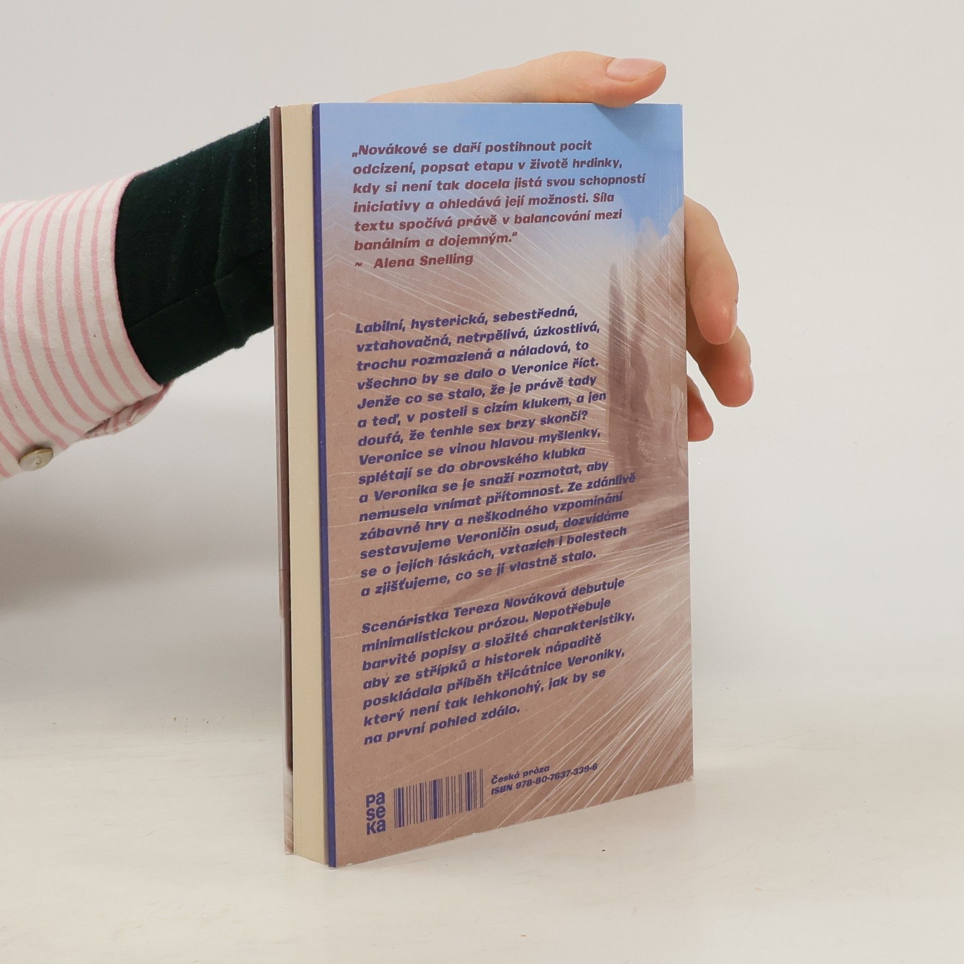 Labilní, hysterická, sebestředná, vztahovačná, netrpělivá, úzkostlivá, trochu rozmazlená a náladová, to všechno by se dalo o Veronice říct. Jenže co se stalo, že je právě tady a teď, v posteli s cizím klukem, a jen doufá, že tenhle sex brzy skončí? Veronice se vinou hlavou myšlenky, splétají se do obrovského klubka a Veronika se je snaží rozmotat, aby nemusela vnímat přítomnost. Ze zdánlivě zábavné hry a neškodného vzpomínání sestavujeme Veroničin osud, dozvídáme se o jejích láskách, vztazích i bolestech a zjišťujeme, co se jí vlastně stalo. Scenáristka Tereza Nováková debutuje minimalistickou prózou. Nepotřebuje barvité popisy a složité charakteristiky, aby ze střípků a historek nápaditě poskládala příběh třicátnice Veroniky, který není tak lehkonohý, jak by se na první pohled zdálo.