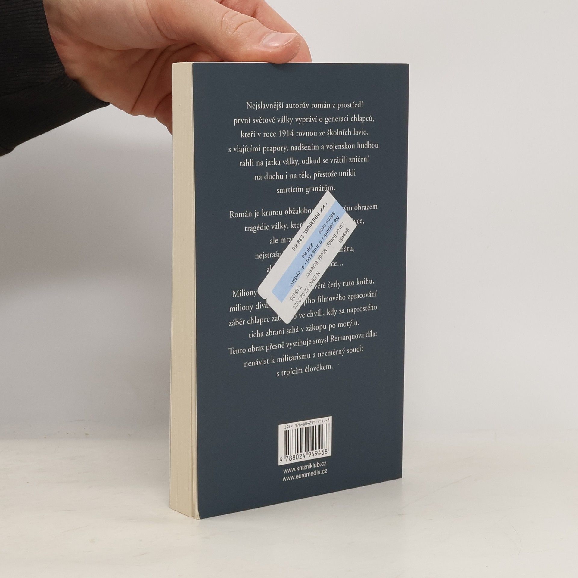 Nejslavnější autorův román z prostředí první světové války vypráví o generaci chlapců, kteří v roce 1914 rovnou ze školních lavic, s vlajícími prapory, nadšením a vojenskou hudbou táhli na jatka války, odkud se vrátili zničení na duchu i na těle, přestože unikli smrtícím granátům. Román je krutou obžalobou a pravdivým obrazem tragédie války, která nezabíjí jednotlivce, ale mrzačí celé generace, nejstrašnější není výbuch granátu, ale zasažené lidské srdce…