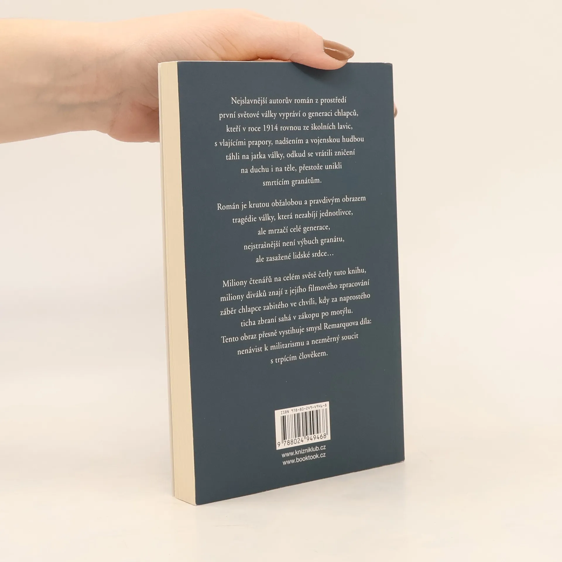 Nejslavnější autorův román z prostředí první světové války vypráví o generaci chlapců, kteří v roce 1914 rovnou ze školních lavic, s vlajícími prapory, nadšením a vojenskou hudbou táhli na jatka války, odkud se vrátili zničení na duchu i na těle, přestože unikli smrtícím granátům. Román je krutou obžalobou a pravdivým obrazem tragédie války, která nezabíjí jednotlivce, ale mrzačí celé generace, nejstrašnější není výbuch granátu, ale zasažené lidské srdce…