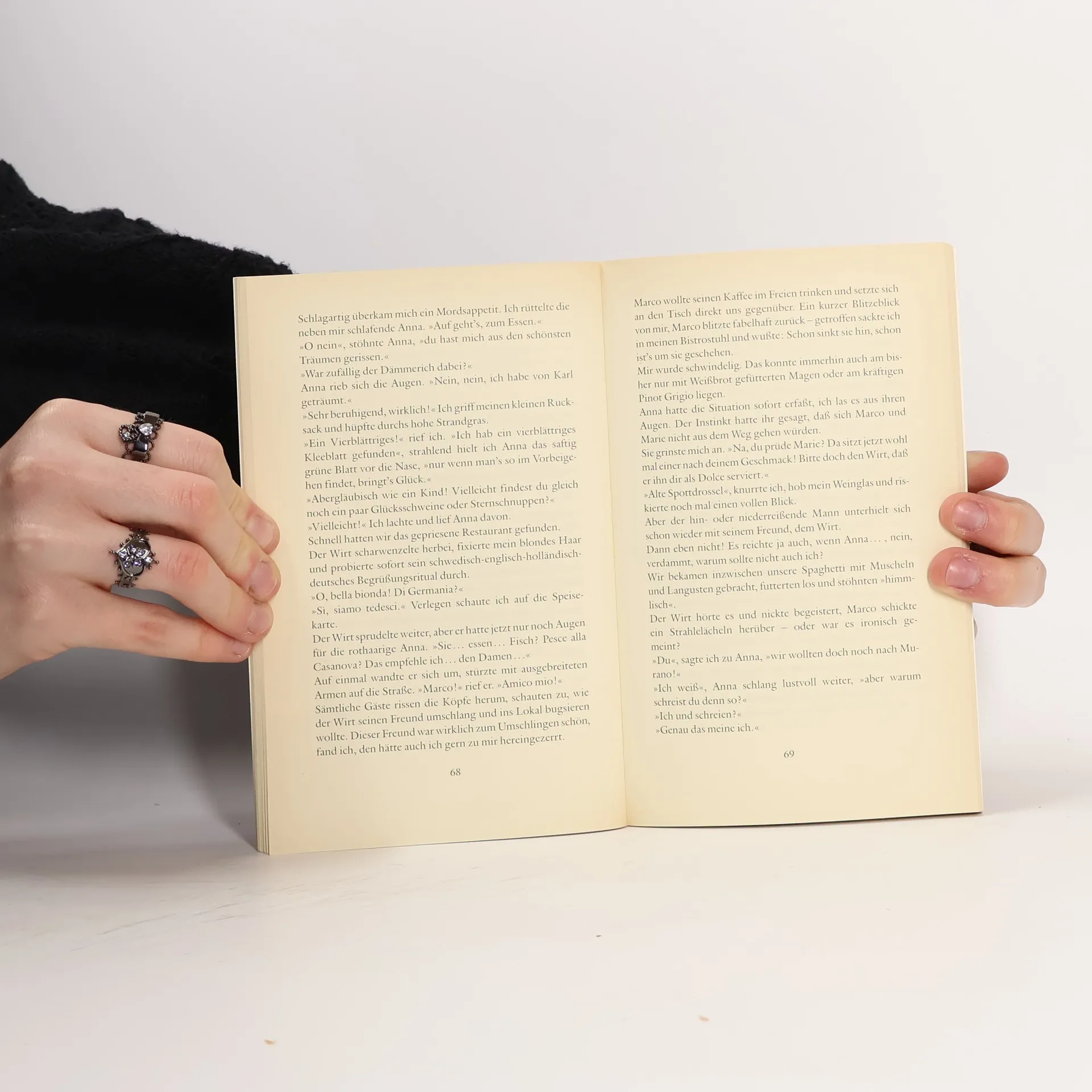 Anna und Marie hoffen aufs kleine Abenteuer in Venedig. In München kaufen sie für alle Fälle gondelschwarze Spitzenwäsche. Nach schlaflos durchlachter Nachtfahrt sitzen sie mächtig aufgepeppt und erwartungsfroh an der Rialtobrücke. Schon stehen Vittorio und Freund Candido bereit, die beiden Frauen durch Gassen und Kanäle zu locken. Doch »Traummänner küssen anders«, finden Anna und Marie. Sie trösten sich mit phantastischen Erzählungen über verflossene Lieben. An der Tür des Café Florian lehnt ein Mann - ein kurzer Blick und Marie ist hypnotisiert, doch Anna zieht sie aus dem Gefahrenbereich. Nachts sehnt sich Marie, hellwach am Fenster, nach dem Mann vom Café. Da steht er plötzlich hingezaubert unten auf dem Platz. Küssend taumeln sie zum Canal Grande... Abends auf dem Bahnhof, in grellem Neonlicht: Anna ernüchtert, Marie traumverloren. »Küß keinen am Canal Grande!« sagt Marie und kneift Anna lachend in die üppigen Hüften. »Ich erzähl dir meine neueste Geschichte, die Geschichte der letzten Nacht!«