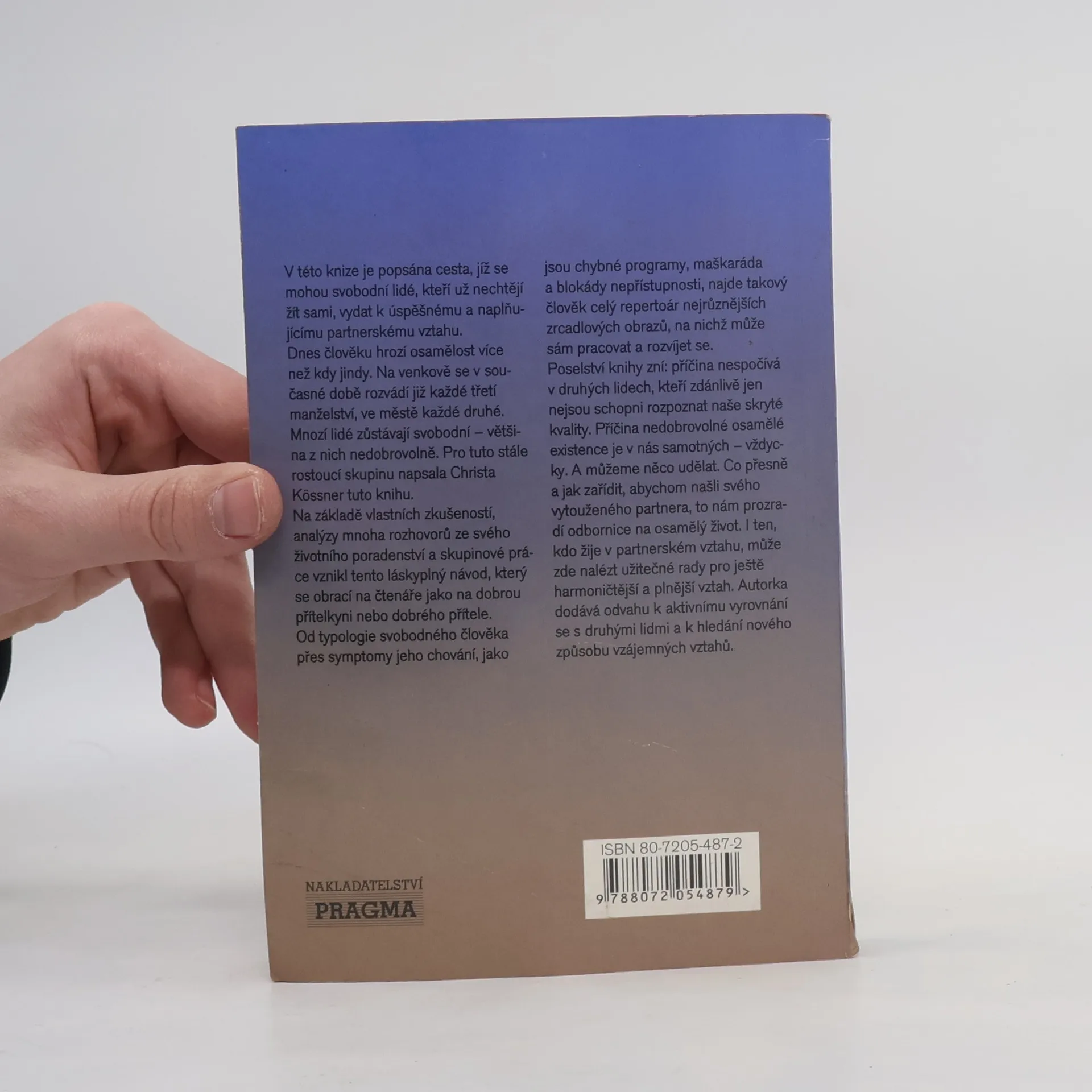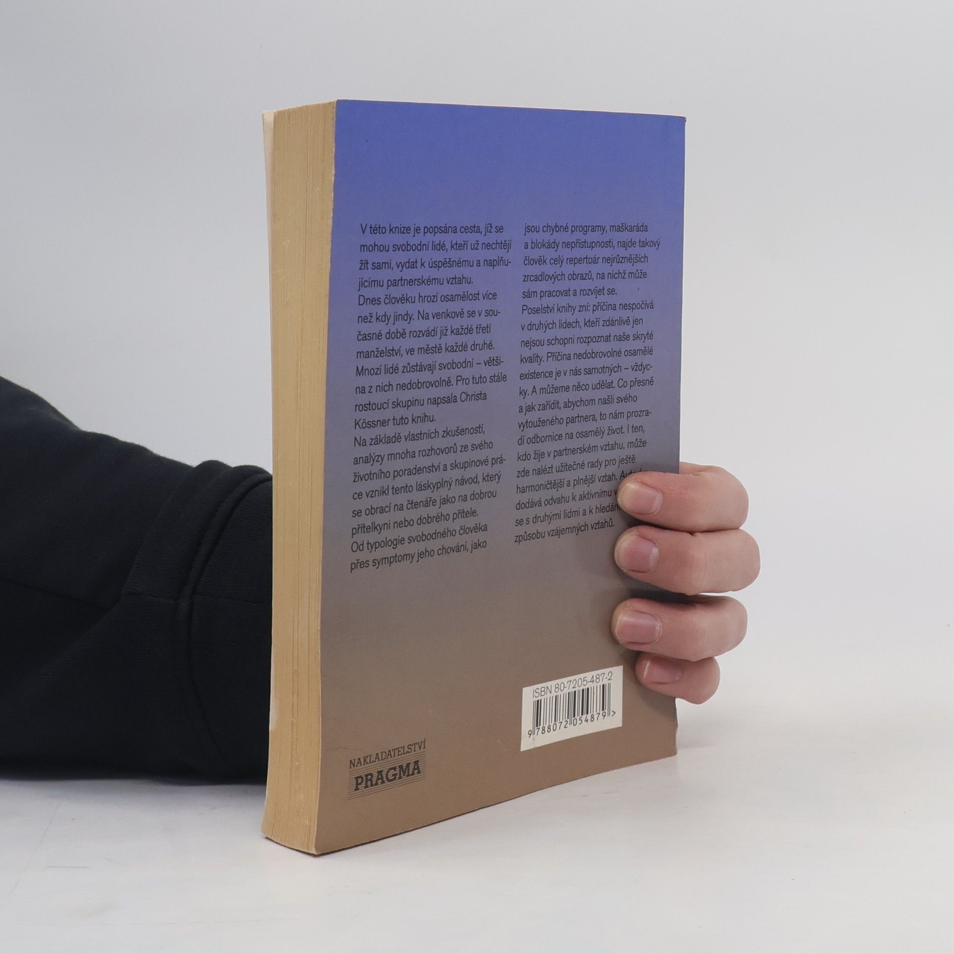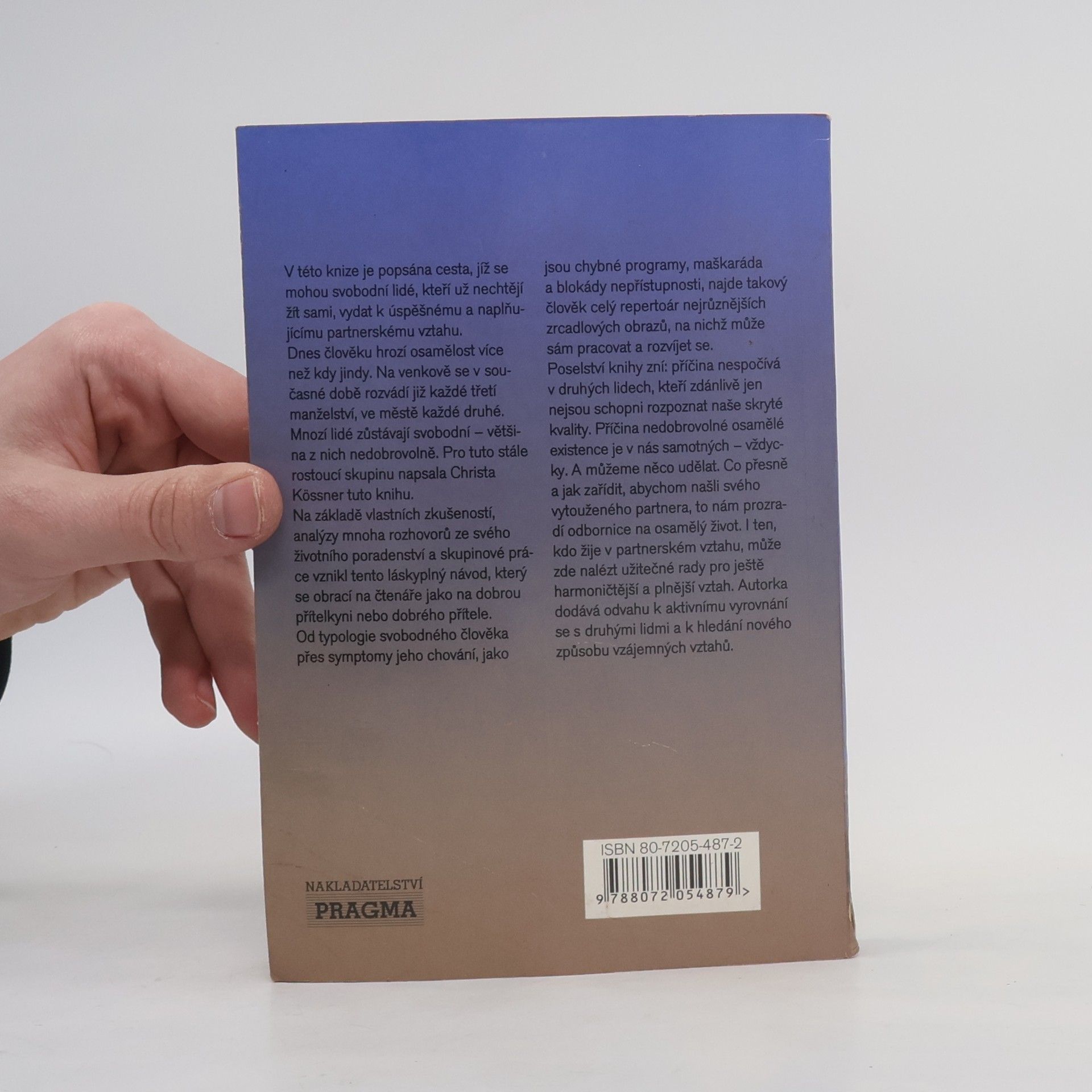 V této knize je popsána cesta, jíž se mohou svobodní lidé, kteří už nechtějí žít sami, vydat k úspěšnému a naplňujícímu partnerskému vztahu. Dnes člověku hrozí osamělost více než kdy jindy. Na venkově se v současné době rozvádí již každé třetí manželství, ve městě každé druhé. Mnozí lidé zůstávají svobodní - většina z nich nedobrovolně. Pro tuto stále rostoucí skupinu napsala Christa Kössner tuto knihu.