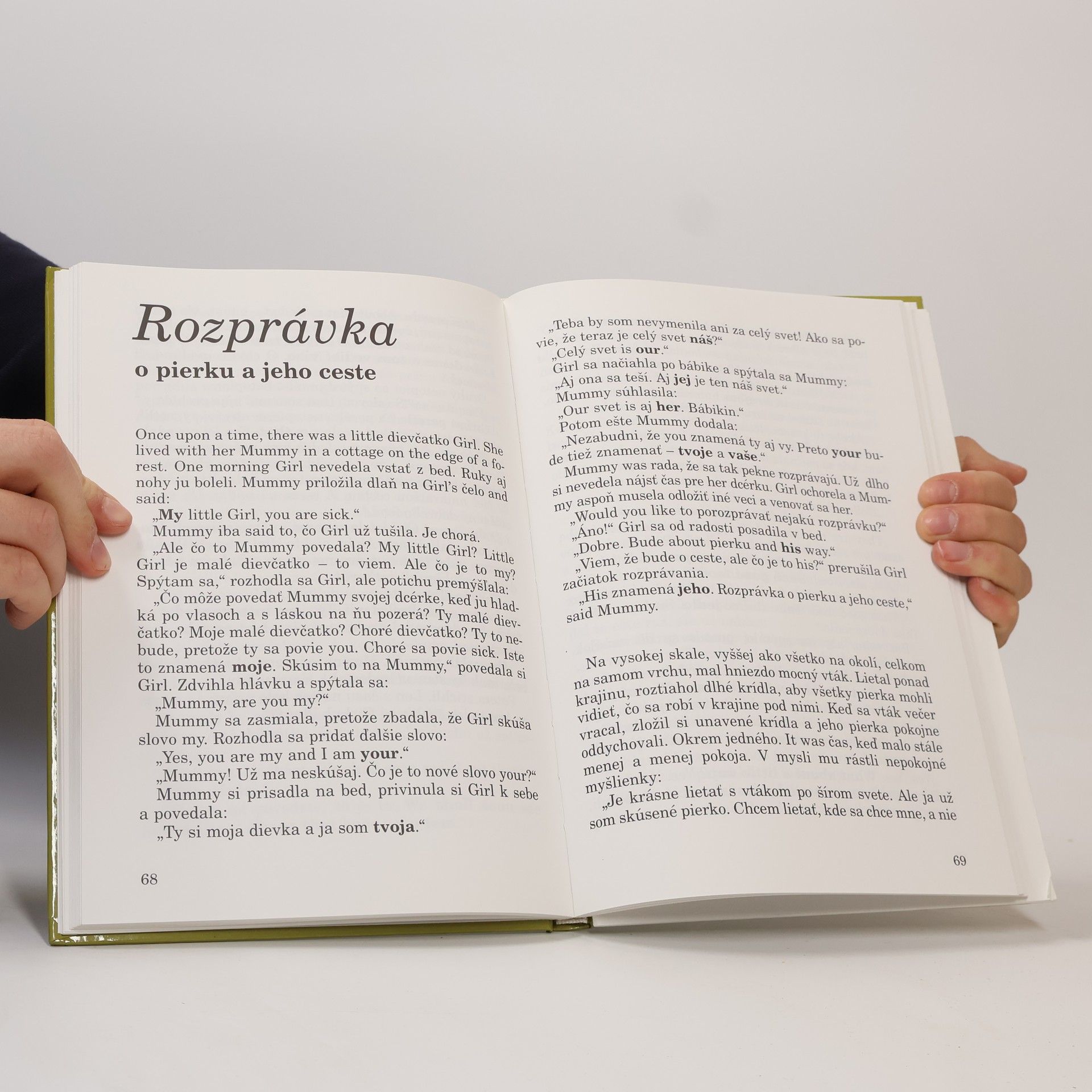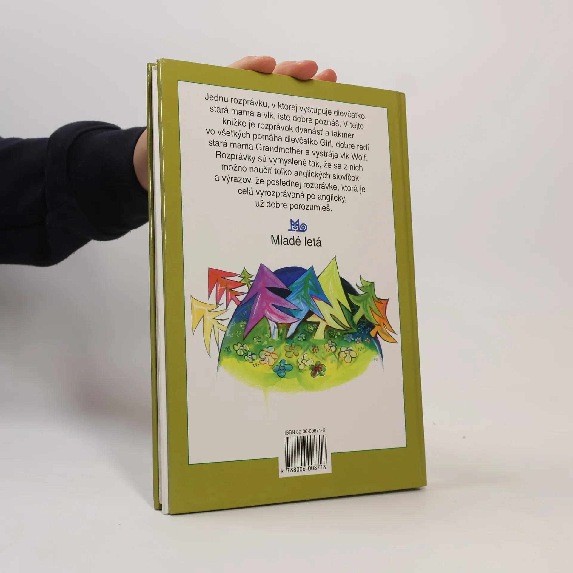 V každej z rozprávok tejto knihy, inšpirovanej rozprávkou o červenej čiapočke, pribúdajú v slovenskom texte anglické slovíčka základnej slovnej zásoby. Posledná rozprávka už je celá po anglicky.