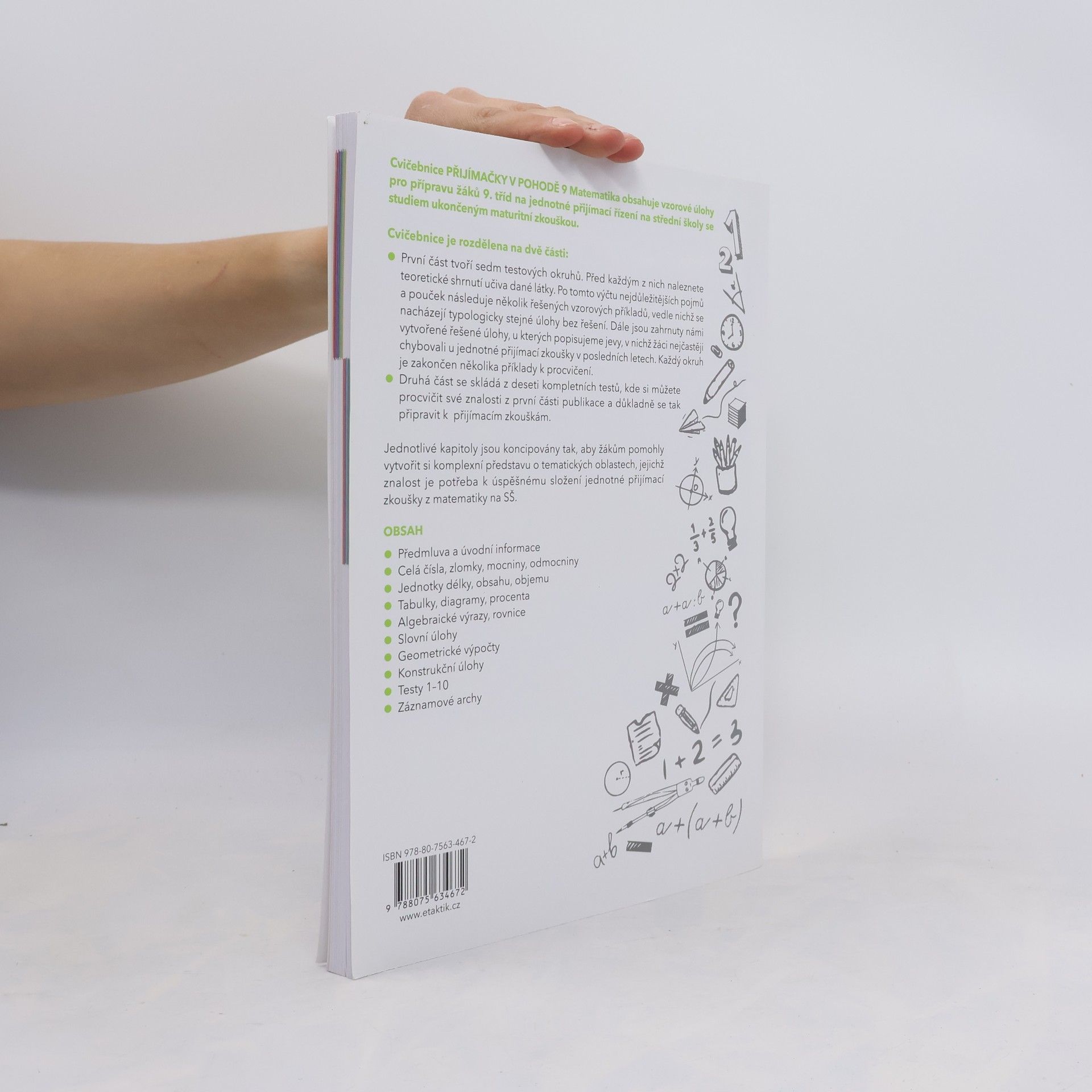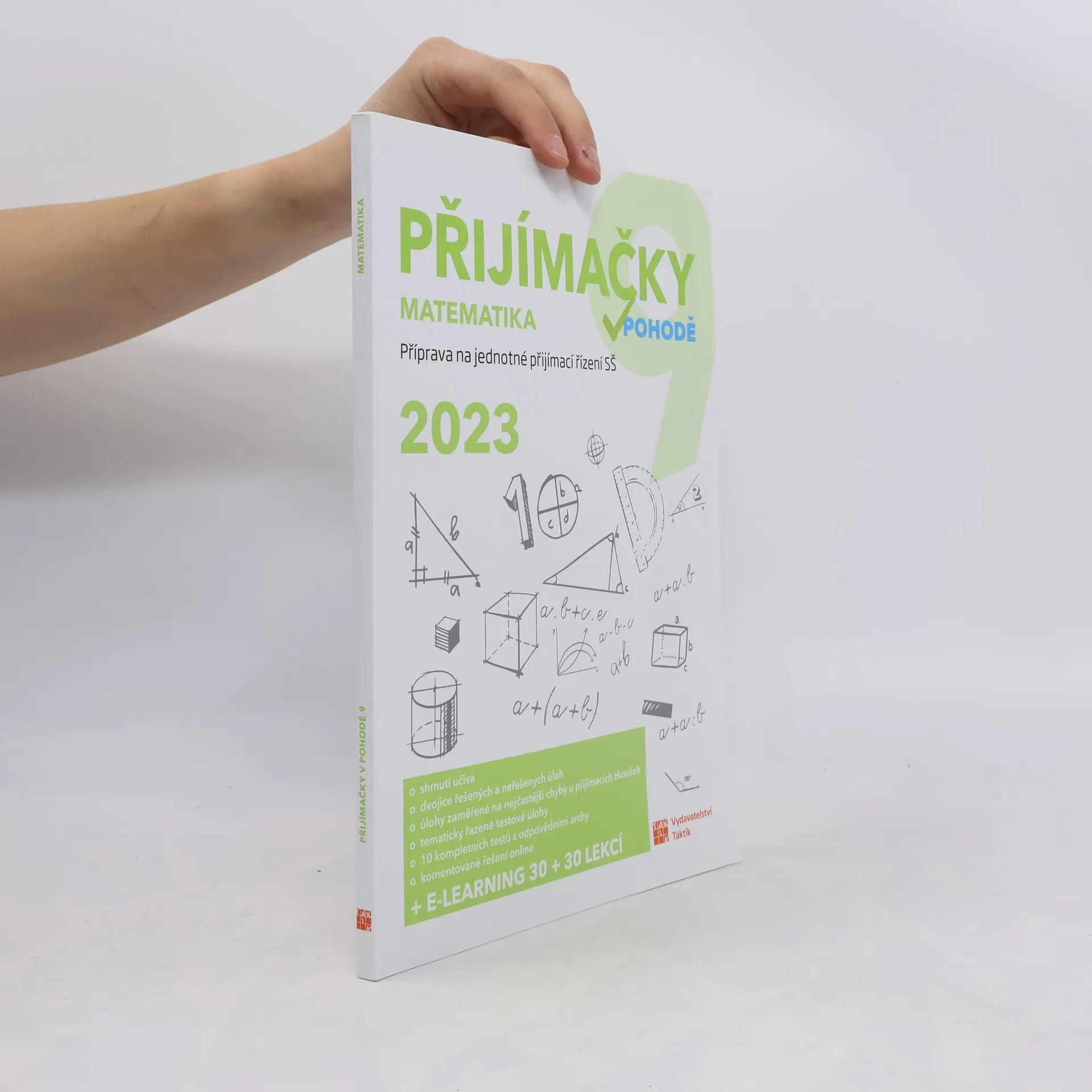 Cvičebnice Přijímačky v pohodě 9 - matematika obsahuje materiály pro komplexní přípravu na Jednotou přijímací zkoušku (JPZ) na střední školy se studiem ukončeným maturitní zkouškou. Příručka obsahuje 7 testovacích okruhů. Každý okruh se skládá ze shrnutí učiva, aby si žák mohl zopakovat potřebnou látku, dvojic řešených a neřešených úloh, kde si žák může prohlédnout vyřešené a podle nich vypočítat ty neřešené, a tím se seznámit s typologií úloh v didaktickém testu. Následují vypracované úlohy, ve kterých se v minulých letech nejvíce chybovalo s radami, jak se chybám vyhnout. Okruh uzavírají úlohy k procvičení. Nakonec si své znalosti muže žák procvičit pomocí 10 ukázkových didaktických testu i s odpovědními archy. K cvičebnici je navíc e-learning s videi vysvětlujícími učivo a dalšími úlohami. Přístup získáte po zaregistrování a zadání přístupového kódu na studium.vpohode.cz, kde najdete vypracovaná řešení a odpovědní archy k úlohám z příručky.