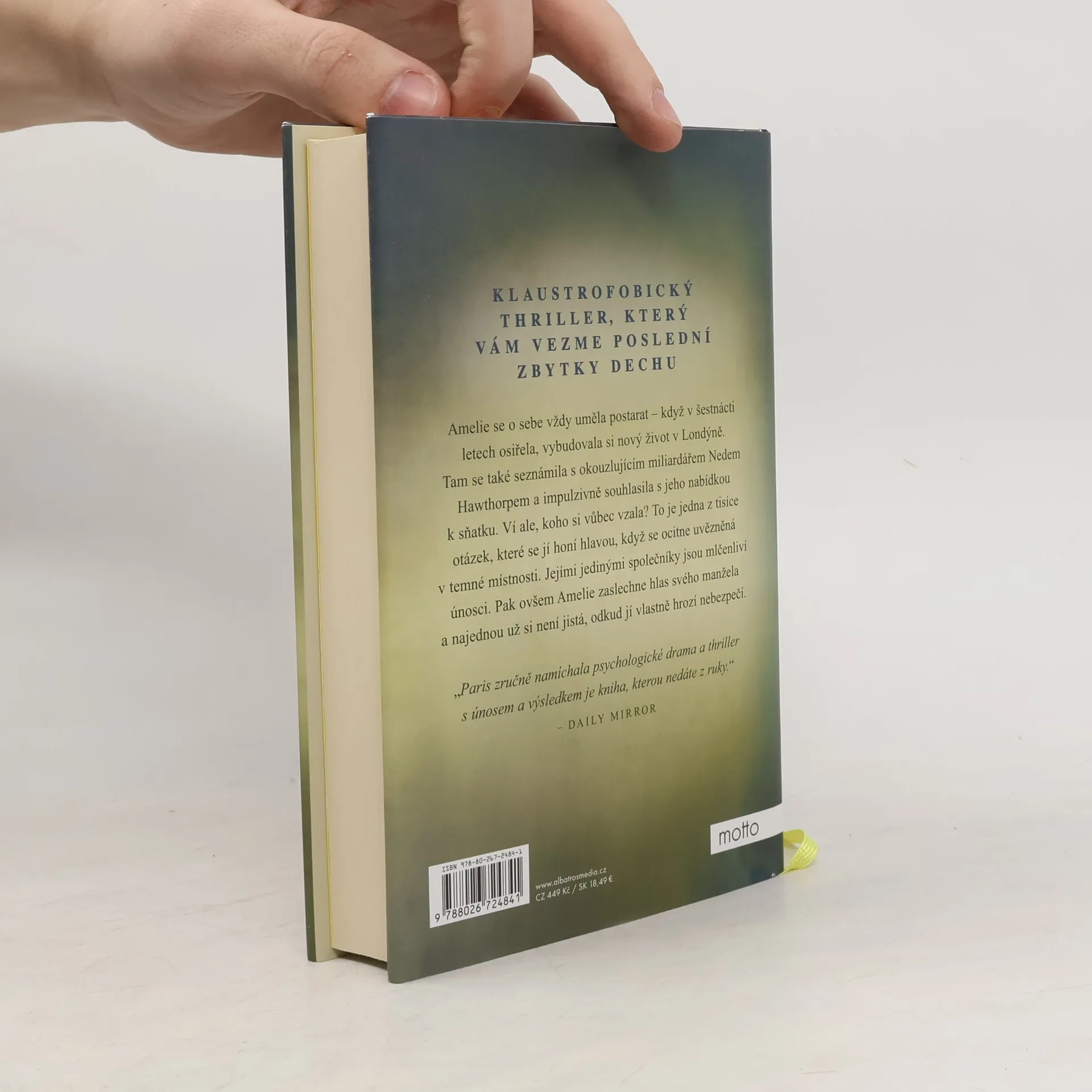 Klaustrofobický thriller, který vám vezme poslední zbytky dechu. Amelie se o sebe vždy uměla postarat – když v šestnácti letech osiřela, vybudovala si nový život v Londýně. Tam se taky seznámila s okouzlujícím miliardářem Nedem Hawthorpem a impulzivně souhlasila s jeho nabídkou k sňatku. Ví ale, koho si vůbec vzala? To je jedna z tisíce otázek, které se jí honí hlavou, když se ocitne uvězněná v temné místnosti. Jejími jedinými společníky jsou mlčenliví únosci. Pak ovšem Amelie zaslechne hlas svého manžela a najednou už si není jistá, odkud jí vlastně hrozí nebezpečí.