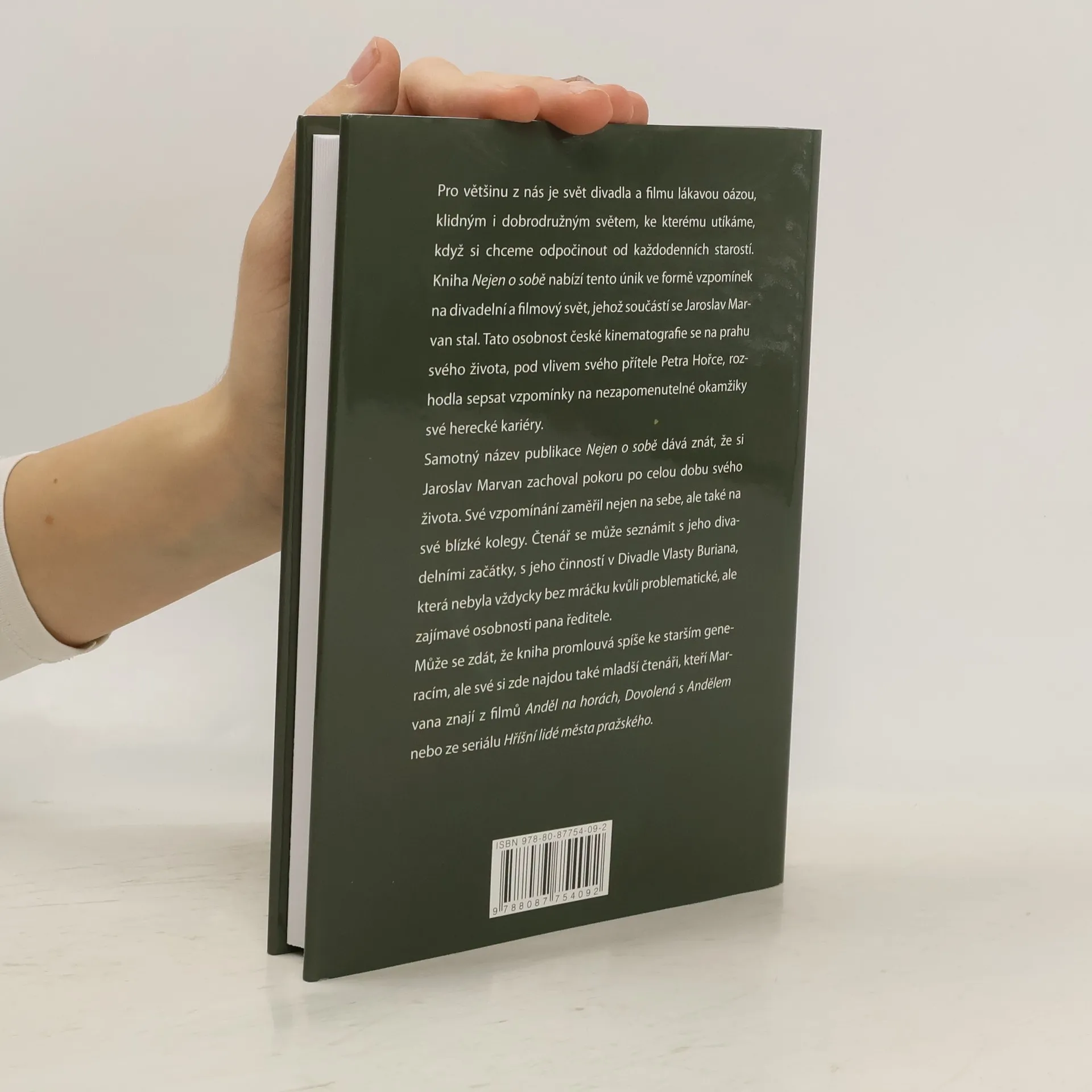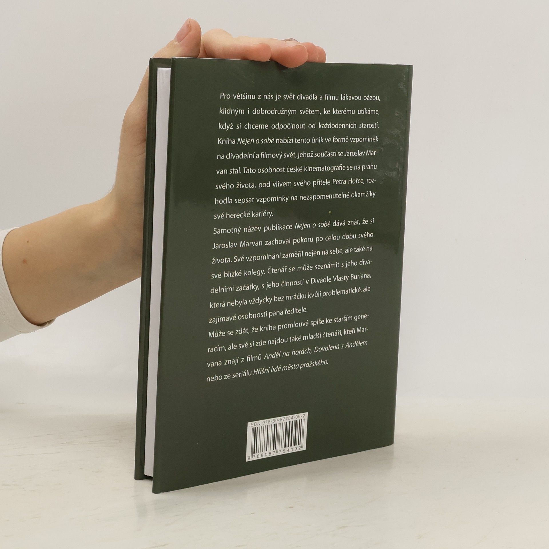 Autorizované literární vzpomínky jednoho z nejoblíbenějších českých herců. Pro většinu z nás je svět divadla a filmu lákavou oázou, klidným i dobrodružným světem, ke kterému utíkáme, když si chceme odpočinout od každodenních starostí. Kniha Nejen o sobě nabízí tento únik ve formě vzpomínek na divadelní a filmový svět, jehož součástí se Jaroslav Marvan stal. Tato osobnost české kinematografie se na prahu svého života, pod vlivem svého přítele Petra Hořce, rozhodla sepsat vzpomínky na nezapomenutelné okamžiky své herecké kariéry. Samotný název publikace Nejen o sobě dává znát, že si Jaroslav Marvan zachoval pokoru po celou dobu svého života. Své vzpomínání zaměřil nejen na sebe, ale také na své blízké kolegy. Čtenář se může seznámit s jeho divadelními začátky, s jeho činností v Divadle Vlasty Buriana, která nebyla vždycky bez mráčku kvůli problematické, ale zajímavé osobnosti pana ředitele. Může se zdát, že kniha promlouvá spíše ke starším generacím, ale své si zde najdou také mladší čtenáři, kteří Marvana znají z filmů Anděl na horách, Dovolená s Andělem nebo ze seriálu Hříšní lidé města pražského.