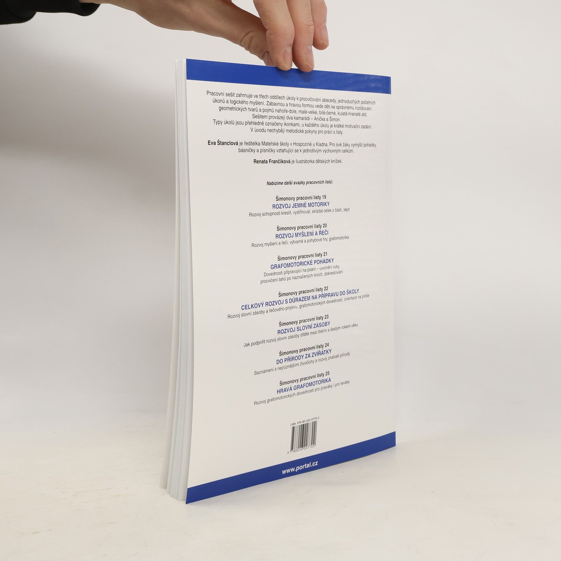 Zábavné počítání, hravá abeceda a poznávání světa pro děti od 4 do 7 let Pracovní sešit zahrnuje ve třech oddílech šedesát úkolů k procvičování abecedy, jednoduchých početních úkonů a logického myšlení. Zábavnou a hravou formou vede děti ke správnému rozlišování geometrických tvarů a pojmů nahoře-dole, malé-velké, bílé-černé, kulaté-hranaté atd. Sešitem provázejí dva kamarádi – Anička a Šimon. Typy úkolů jsou přehledně označeny ikonkami, u každého úkolu je krátké motivační zadání. V úvodu nechybějí metodické pokyny pro práci s listy. E. Štanclová je ředitelka Mateřské školy v Hospozíně u Kladna. Pro své žáky vymýšlí pohádky, básničky a písničky vztahující se k jednotlivým výchovným celkům. R. Frančíková je ilustrátorka dětských knížek Publikace: Šimonovy pracovní listy 13 - Eva Štanclová.