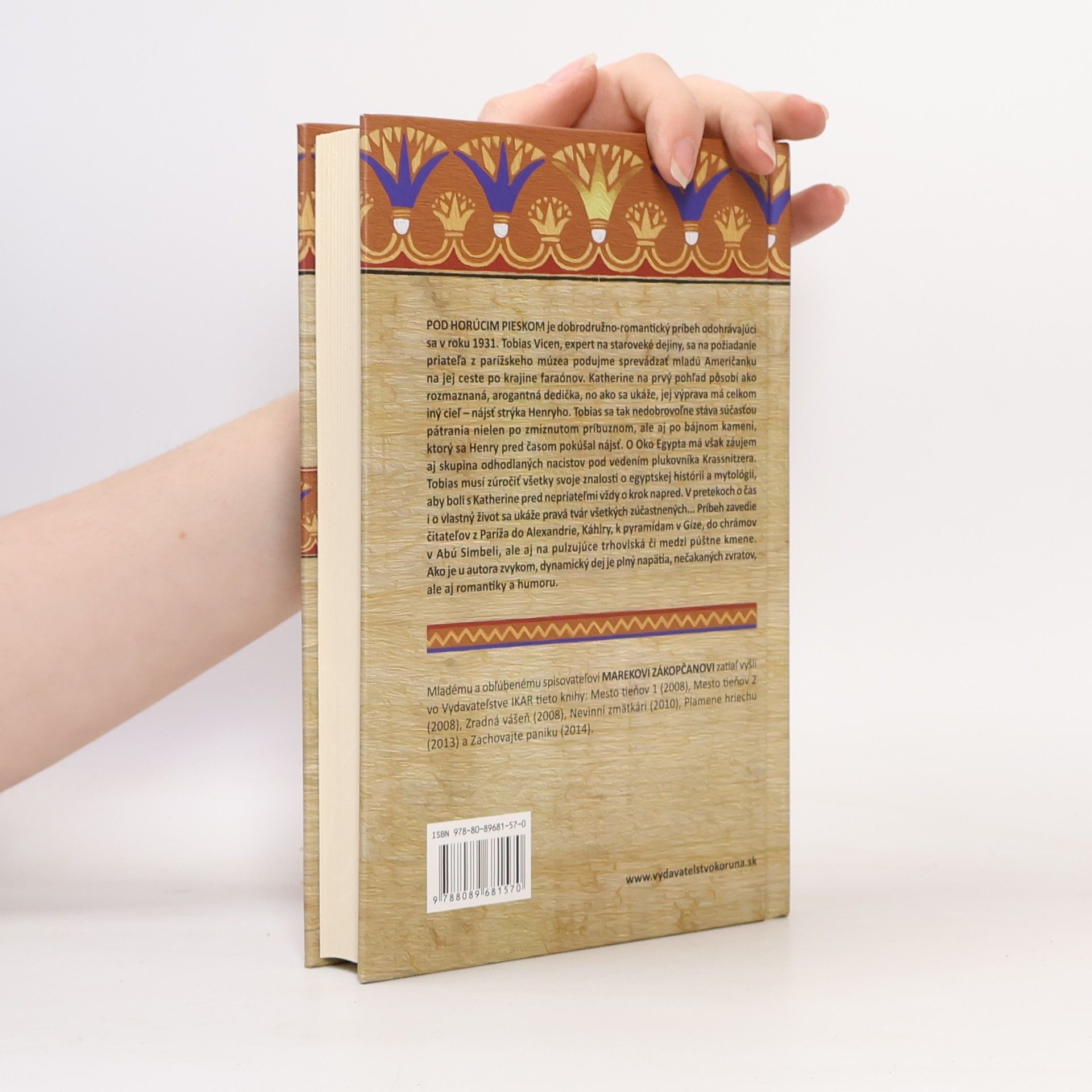 Pod horúcim pieskom je dobrodružno-romantický príbeh odohrávajúci sa v roku 1931. Tobias Vicen, expert na staroveké dejiny, sa na požiadanie priateľa z parížskeho múzea podujme sprevádzať mladú Američanku na jej ceste po krajine faraónov. Katherine na prvý pohľad pôsobí ako rozmaznaná, arogantná dedička, no ako sa ukáže, jej výprava má celkom iný cieľ – nájsť strýka Henryho. Tobias sa tak nedobrovoľne stáva súčasťou pátrania nielen po zmiznutom príbuznom, ale aj po bájnom kameni, ktorý sa Henry pred časom pokúšal nájsť. O Oko Egypta má však záujem aj skupina odhodlaných nacistov pod vedením plukovníka Krassnitzera. Tobias musí zúročiť všetky svoje znalosti o egyptskej histórii a mytológii, aby boli s Katherine pred nepriateľmi vždy o krok napred. V pretekoch o čas i o vlastný život sa ukáže pravá tvár všetkých zúčastnených... Príbeh zavedie čitateľov z Paríža do Alexandrie, Káhiry, k pyramídam v Gíze, do chrámov v Abú Simbeli, ale aj na pulzujúce trhoviská či medzi púštne kmene. Ako je u autora zvykom, dynamický dej je plný napätia, nečakaných zvratov, ale aj romantiky a humoru.