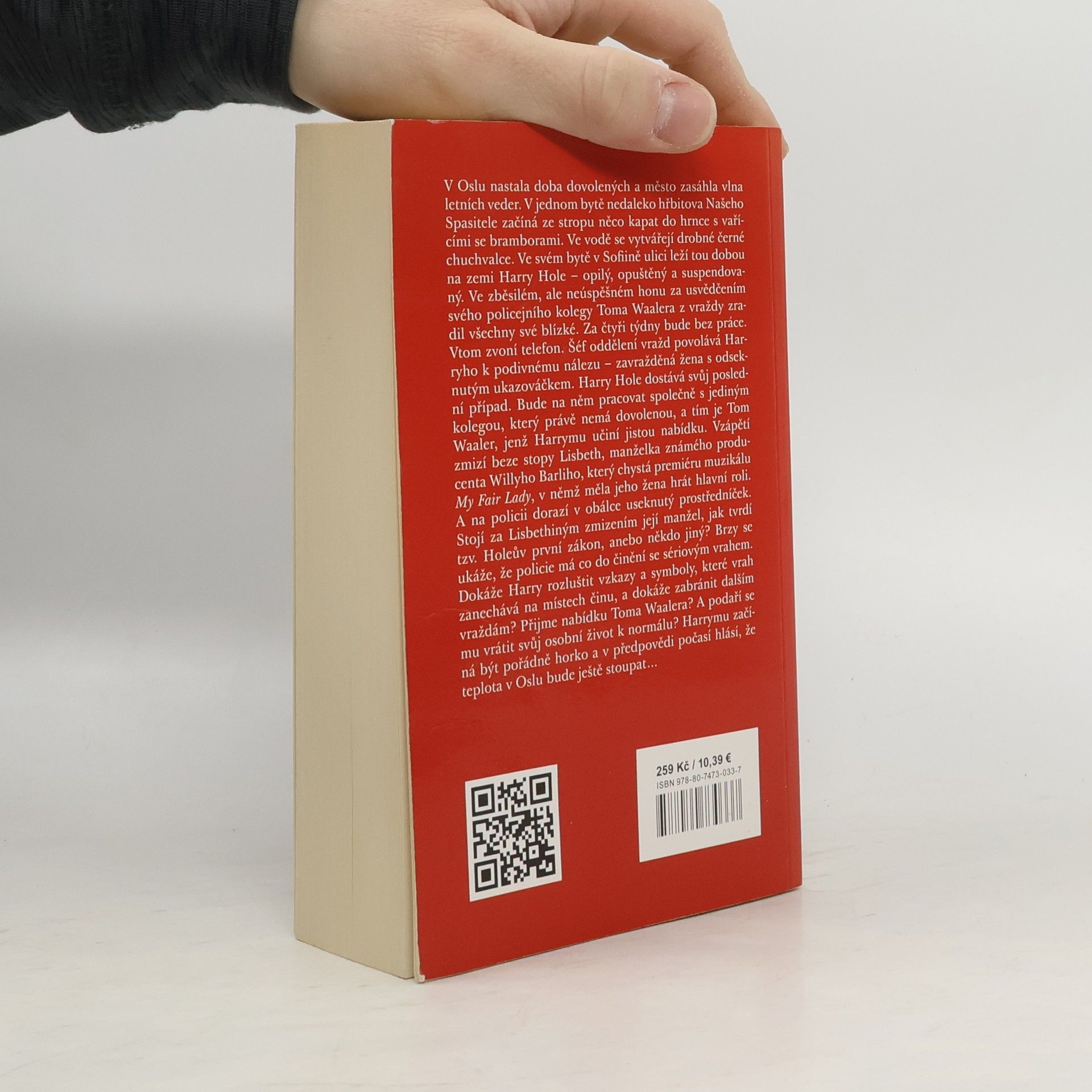 V Oslu začíná období prázdnin a dovolených a město zasáhla vlna letních veder. V jednom bytě nedaleko hřbitova Našeho Spasitele začíná ze stropu něco kapat do hrnce s vařícími se bramborami. Ve vodě se tvoří drobné černé chuchvalce. Ve svém bytě v Sofiině ulici leží tou dobou na zemi Harry Hole – opilý, opuštěný a suspendovaný. Ve zběsilém, ale neúspěšném honu za usvědčením svého policejního kolegy Toma Waalera z vraždy zradil všechny své blízké. Za čtyři týdny bude bez práce. Vtom zvoní telefon. Šéf oddělení vražd povolává Harryho k podivnému nálezu – zavražděná žena s odseknutým prstem. Harry Hole dostává svůj poslední případ. Bude na něm pracovat společně s jediným kolegou, který právě nemá dovolenou, s Tomem Waalerem, jenž Harrymu učiní jistou nabídku. Vzápětí zmizí beze stopy Lisbeth, manželka známého producenta Willyho Barliho, který chystá premiéru muzikálu My Fair Lady, v němž měla jeho žena hrát hlavní roli. A na policii dorazí v obálce useknutý prstem. Stojí za Lisbethiným zmizením její manžel, jak tvrdí tzv. Holeův první zákon, anebo někdo jiný? Brzy se ukáže, že policie má co do činění se sériovým vrahem. Dokáže Harry rozluštit vzkazy a symboly, které vrah zanechává na místech činu, a dokáže zabránit dalším vraždám? Přijme nabídku Toma Waalera? A podaří se mu vrátit svůj osobní život k normálu? Harrymu začíná být pořádně horko. 2. vydání