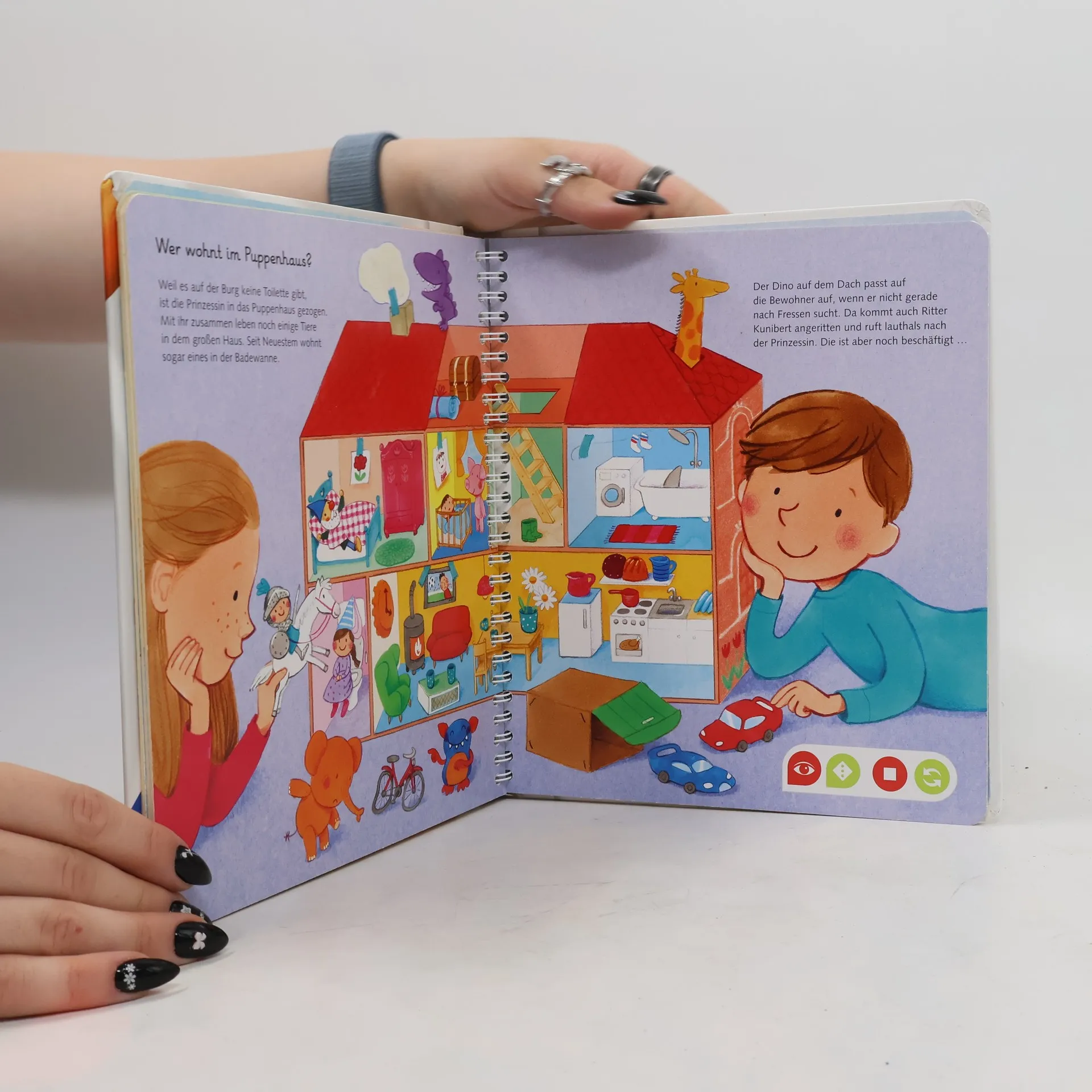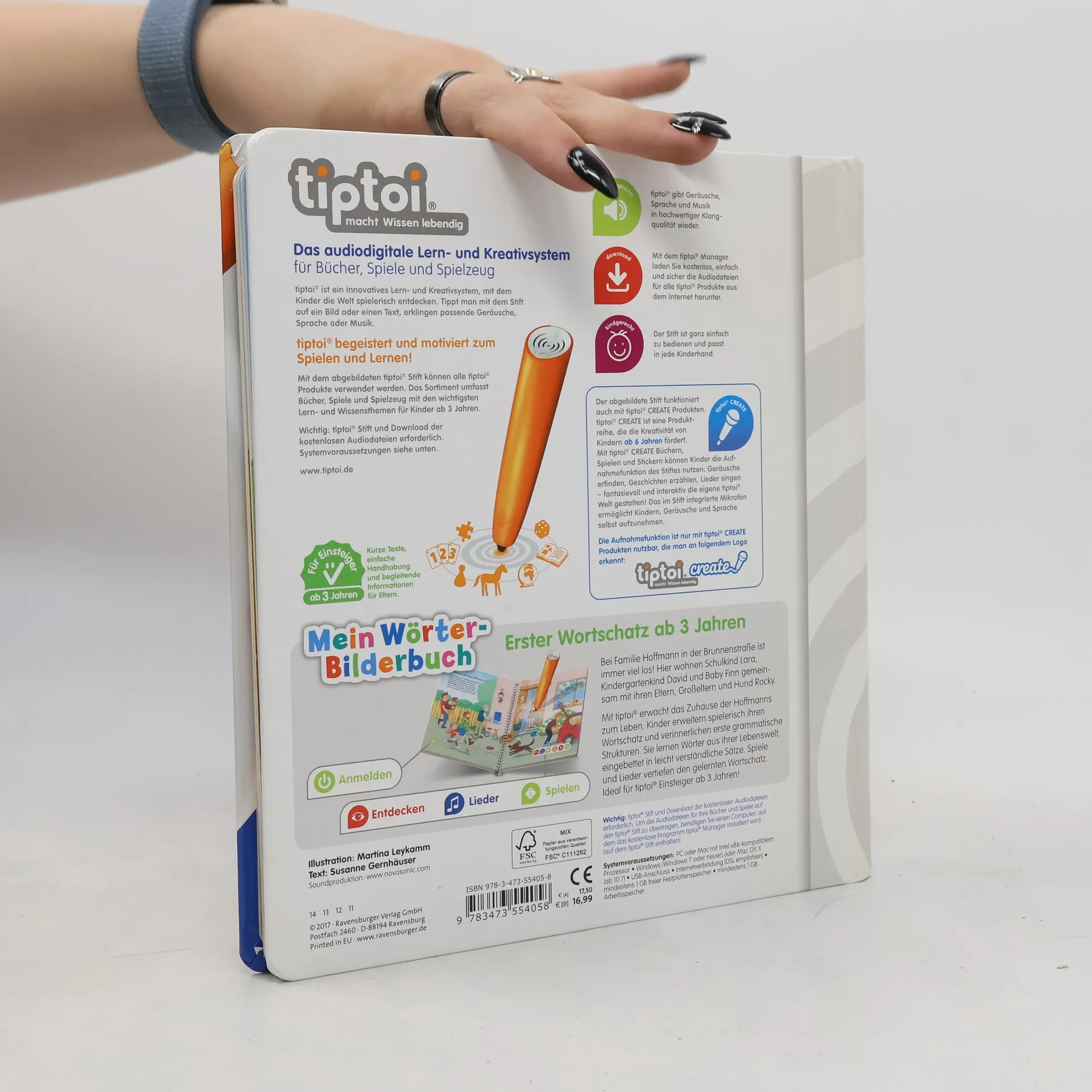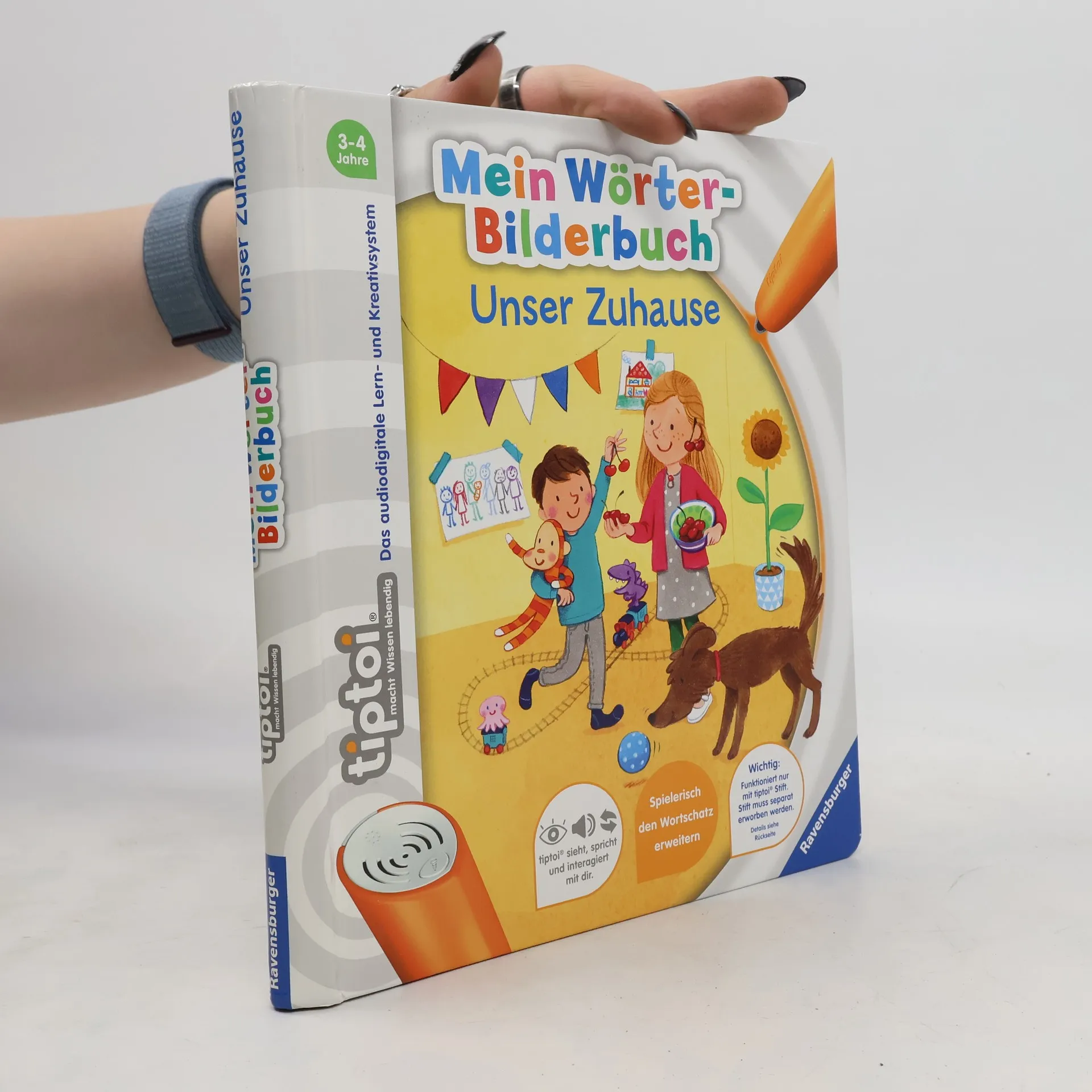 Wörterlernen leicht gemacht: spielerischer Spracherwerb! Willkommen bei uns Zuhause! Hier wohnen Schulkind Lara, Kindergartenkind David und Baby Finn gemeinsam mit ihren Eltern, Großeltern und Hund Rocky. Mit tiptoi erwacht das Zuhause der Hoffmanns zum Leben. Was gibt es in der Küche zu entdecken? Welche Farben hat das Spielzeug? Was macht man vor dem Zubettgehen? Kinder erweitern spielerisch ihren Wortschatz und verinnerlichen erste grammatische Strukturen. Spiele und Lieder vertiefen den gelernten Wortschatz. Mit der Reihe tiptoi Mein Wörter-Bilderbuch bauen Kinder spielerisch ihren Wortschatz auf und erweitern diesen selbstständig. Die kurzen, leicht verständlichen Texte eignen sich ideal für Kinder ab 3 Jahren. Jedes Buch zeigt den Kindern bekannte Szenen und Situationen und vermittelt viele vertraute Begriffe aus dem direkten Umfeld und der Erfahrungswelt der Kinder. Überall gibt es spannende Sätze, zahlreiche Dialoge und lustige Geräusche zu entdecken. Dabei sind die einzelnen Begriffe in ganze Sätze eingebunden, um den Kindern erste grammatische Strukturen zu vermitteln. In jedem Buch wird das Gelernte durch kindgerechte und abwechslungsreiche Spiele mit Lösungskontrolle abgefragt und vertieft. Neukomponierte Lieder und liebevolle Geschichten motivieren zum spielerischen Wörterlernen. tiptoi-Stift nicht enthalten. Muss separat erworben werden.
