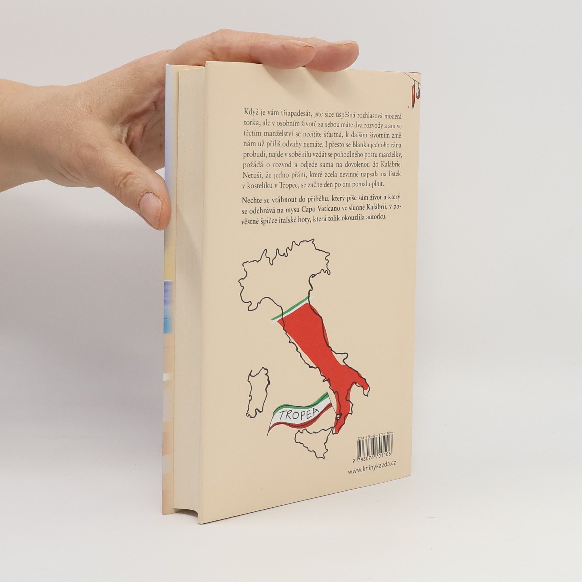 Když je vám třiapadesát, jste sice úspěšná rozhlasová moderátorka, ale v osobním životě za sebou máte dva rozvody a ani ve třetím manželství se necítíte šťastná, k dalším životním změnám už příliš odvahy nemáte. I přesto se Blanka jednoho rána probudí, najde v sobě sílu vzdát se pohodlného postu manželky, požádá o rozvod a odjede sama na dovolenou do Kalábrie. Netuší, že jedno přání, které zcela nevinně napsala na lístek v kostelíku v Tropee, se začne den po dni pomalu plnit. Nechte se vtáhnout do příběhu, který píše sám život a který se odehrává na mysu Capo Vaticano ve slunné Kalábrii, v pověstné špičce italské boty, která tolik okouzlila autorku.