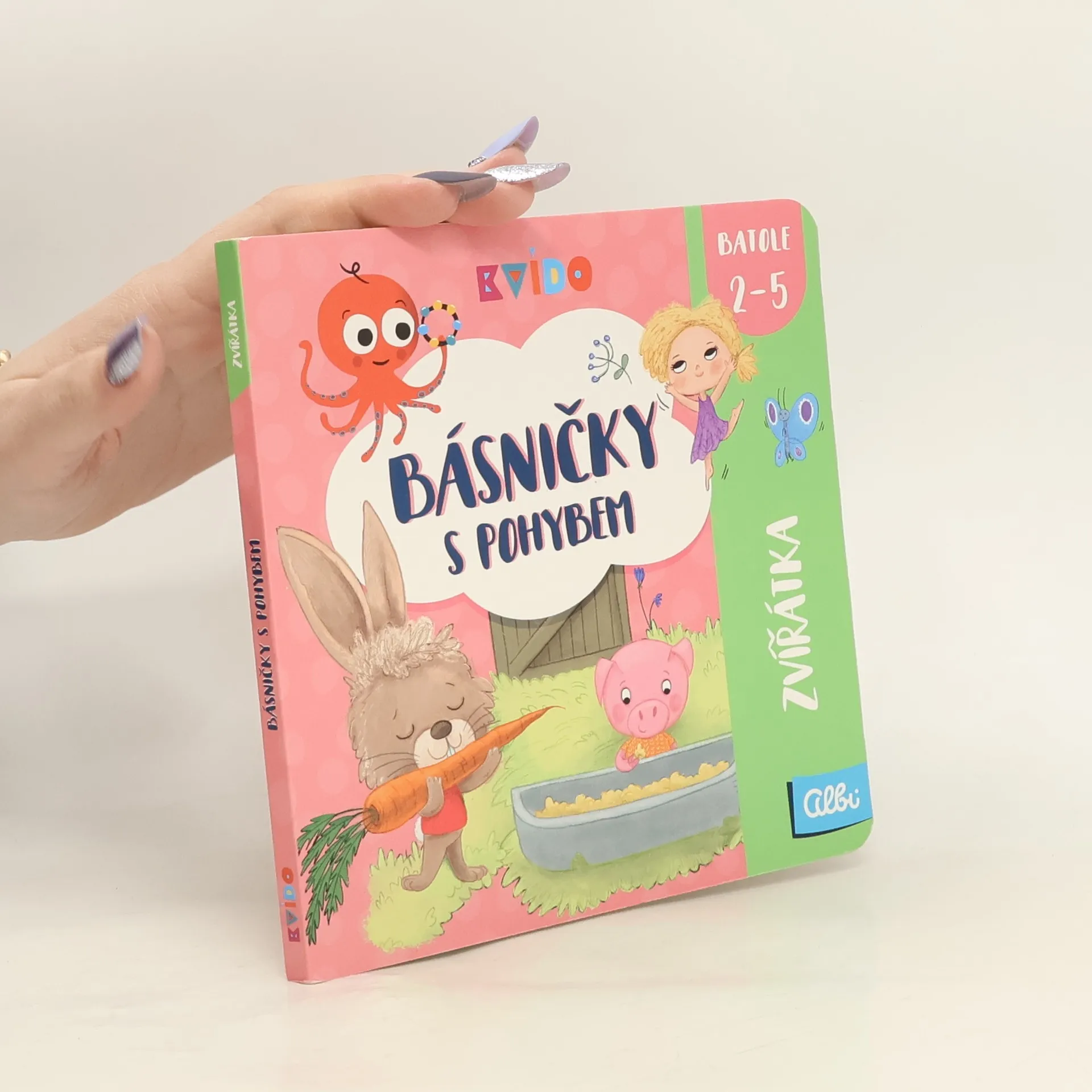 V knize Básničky s pohybem - Denní činnosti od Kvída najdete 6 rytmických básniček doplněných pestrými obrázky týkající se denních činností, jako je například vstávání či oblékání a jednoduchými pohyby a gesty je mohou již děti od 2 let zkoušet provádět společně s básničkou. Kombinace slovního a fyzického cvičení podporuje jejich koncentraci, paměť a urychluje rozvoj řeči. A navíc je to zábava!