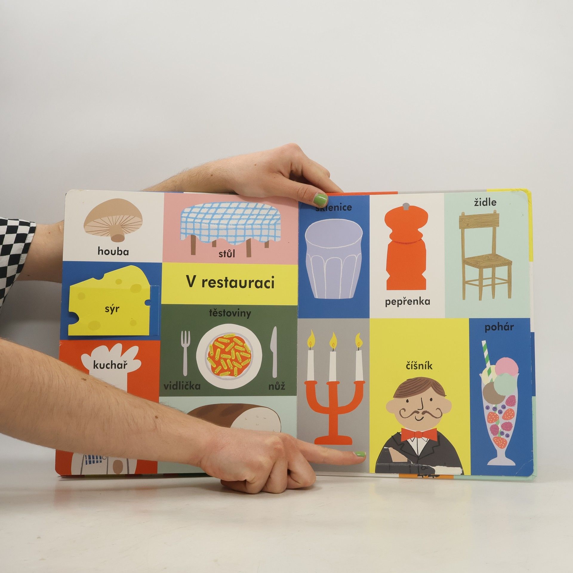 Rozšiřujte slovní zásobu svého dítěte pomocí tohoto leporela s barevnými obrázky a odklápěcími okénky.