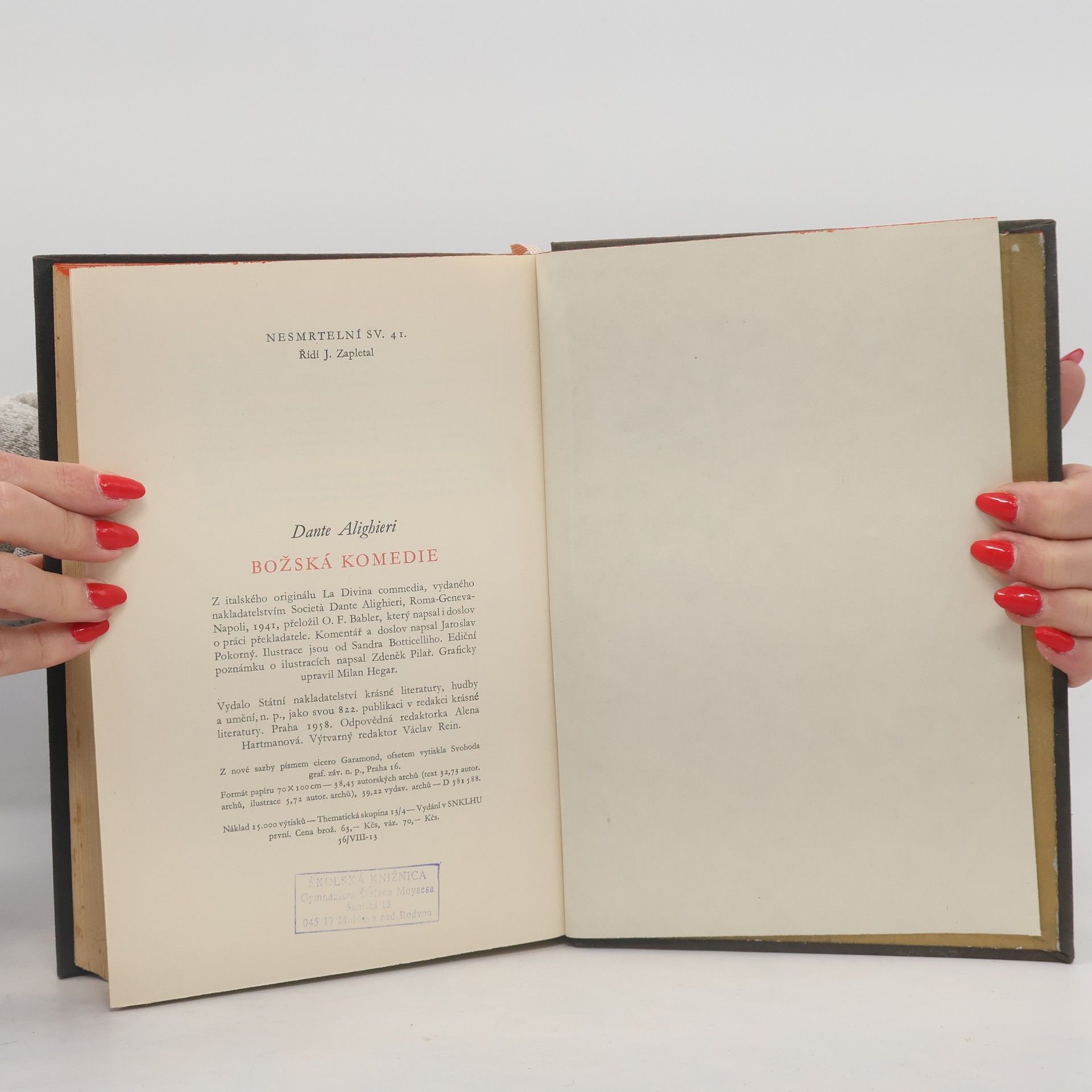 Kompletní vydání Božské komedie v novém překladu. Velkoryse rozvržená Božská komedie, jedno ze základních literárních děl světové literatury, už osm století upoutává pozornost čtenářů na celém světě. Dante Alighieri (1265–1321), básník a učenec, který mimo jiné stojí u základů spisovného italského jazyka, shrnul ve svém nejvýznamnějším, neobyčejně důmyslně komponovaném díle veškeré vědění své doby. Báseň je postavena na základním principu čísla tři: skládá se ze tří částí – Pekla, Očistce a Ráje, je napsána v sugestivních terciích. Na pouti záhrobní říší, která je symbolickým obrazem lidského života, od prvotního hříchu až po spasení a probuzení k věčnému životu, a očistcem autora provází římský básník Vergilius. ve třetím dílu, věnovaném ráji, se potom k básníkovi připojí milovaná Beatrice. Od 19. století se Dantovo dílo stalo výzvou pro nejlepší české překladatele (J. Vrchlického, O. F. Bablera a další). Do této řady patří i nejnovější překlad Vladimíra Mikeše. Z italského originálu přeložil, poznámkami opatřil a statě Doba a život, Dante v našich zemích a Dantova tajemná výzva ženství napsal Vladimír Mikeš.