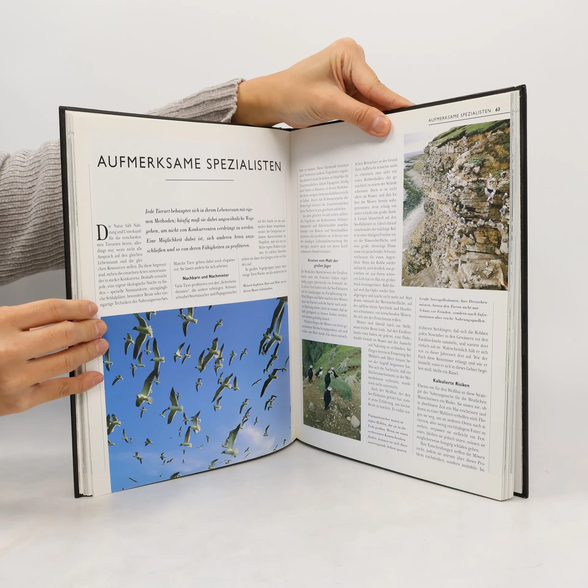 Mit vielen Farbfotos. Aus dem Lernen fürs Leben: Durch Erfahrung klug, vom Spiel zum Ernst, Übung macht den Meister; Instinkt und Kreativität: Mit Werkzeugen ans Ziel, kleine und grosse Baumeister, aufmerksame Spezialisten; Überlebensstrategien: Gemeinsam geht es besser, ererbtes Verhalten oder Weitsicht?, Gefahr im Verzug, die Kunst der Täuschung; Tiere und Menschen: Zum Dienen abgerichtet, Kämpfer, Showstars, Gefährten, der Intelligenz auf der Spur, Verstand bei Tieren?