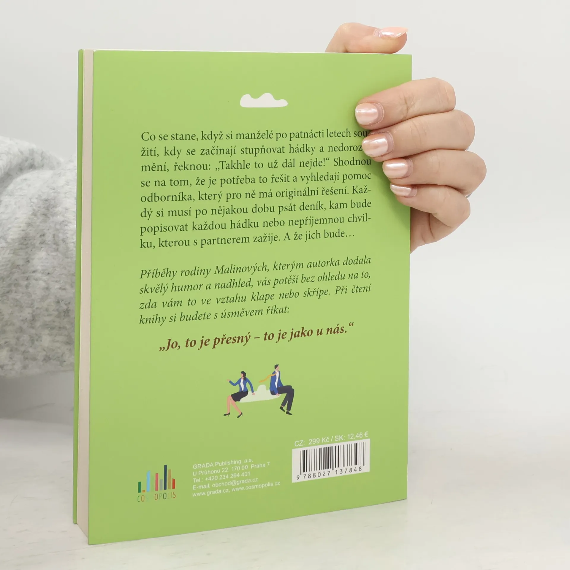 Co se stane, když si manželé po patnácti letech soužití, kdy se začínají stupňovat hádky a nedorozumění, řeknou: „Takhle to už dál nejde!“ Shodnou se na tom, že je potřeba to řešit a vyhledají pomoc odborníka, který pro ně má originální řešení. Každý si musí po nějakou dobu psát deník, kam bude popisovat každou hádku nebo nepříjemnou chvilku, kterou s partnerem zažije. A že jich bude…Příběhy rodiny Malinových, kterým autorka dodala skvělý humor a nadhled vás potěší bez ohledu na to, zda vám to ve vztahu klape nebo skřípe. Při čtení knihy si budete s úsměvem říkat: „Jo, to je přesný – to je jako u nás.“