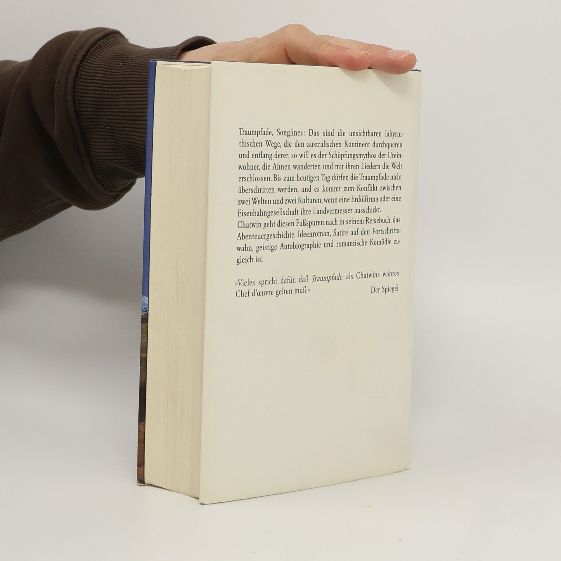 Traumpfade, Songlines: das sind die unsichtbaren labyrinthischen Wege, die den australischen Kontinent durchqueren und entlang denen die Ahnen der Ureinwohner wanderten, die mit ihren Liedern die Welt erschlossen. Bis heute dürfen die Traumpfade nicht überschritten werden, und es kommt zum Konflikt zwischen zwei Welten, wenn eine Eisenbahngesellschaft ihre Landvermesser ausschickt. In seinem Reisebuch, das Ideenroman, Abenteuergeschichte, Satire auf den Fortschrittswahn und geistige Autobiographie zugleich ist, schildert Bruce Chatwin eine Reise durch Australien. Der Roman ist durchzogen von grandiosen Landschaftsbeschreibungen, leuchtenden Details und Reflexionen, die alle in ein Hohelied auf den Menschen münden.