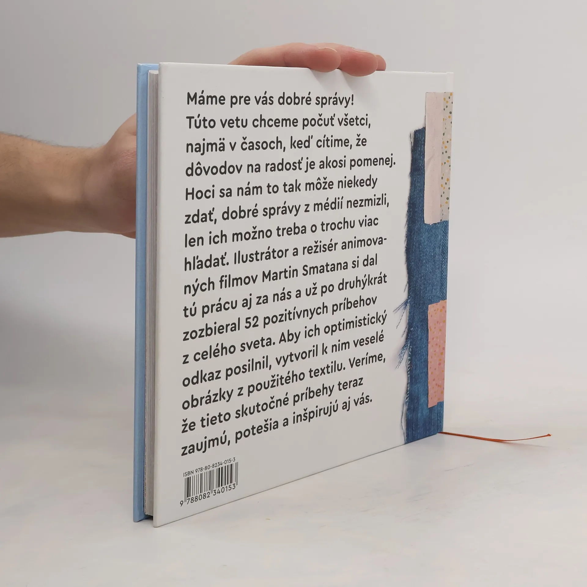 Máme pre vás dobré správy! Túto vetu chceme počuť všetci, najmä v časoch, kedy cítime, že dôvodov na radosť je akosi pomenej. Hoci sa nám to tak môže niekedy zdať, dobré správy z médií nezmizli, len ich možno treba o trochu viac hľadať. Ilustrátor a režisér animovaných filmov Martin Smatana si dal tú prácu aj za nás a už po druhýkrát zozbieral 52 pozitívnych príbehov z celého sveta. Aby ich optimistický odkaz posilnil, vytvoril k nim veselé obrázky z použitého textilu. Veríme, že tieto skutočné príbehy teraz zaujmú, potešila a inšpirujú aj vás.