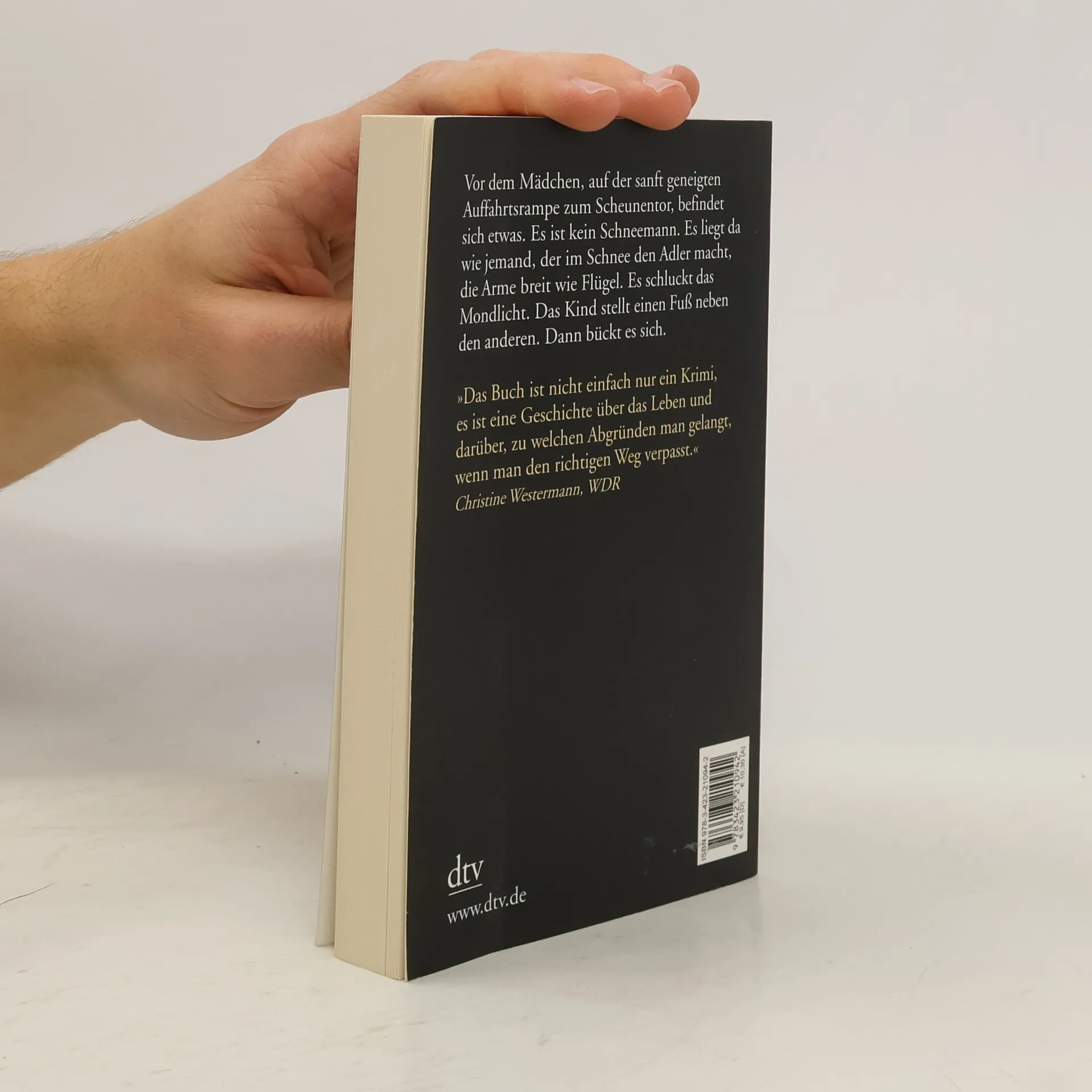 Ausgezeichnet mit dem Deutschen Krimipreis 2007 »Jetzt sind wir zu dritt«, sagt das Mädchen. Es dreht sich herum und herum und fühlt sich zufrieden, so als würde die ganze Welt es betrachten. Dann weiß es plötzlich, dass es noch ein Stück gehen muss. Vor ihm, auf der sanft geneigten Auffahrtsrampe zum Scheunentor, befindet sich etwas. Es ist kein Schneemann. Es liegt da wie jemand, der im Schnee den Adler macht, die Arme breit wie Flügel. Es schluckt das Mondlicht. Das Kind stellt einen Fuß neben den anderen. Dann bückt es sich. Das Buch ist nicht einfach nur ein Krimi, es ist eine Geschichte über das Leben und darüber, zu welchen Abgründen man gelangt, wenn man den richtigen Weg verpasst.« Christine Westermann, WDR