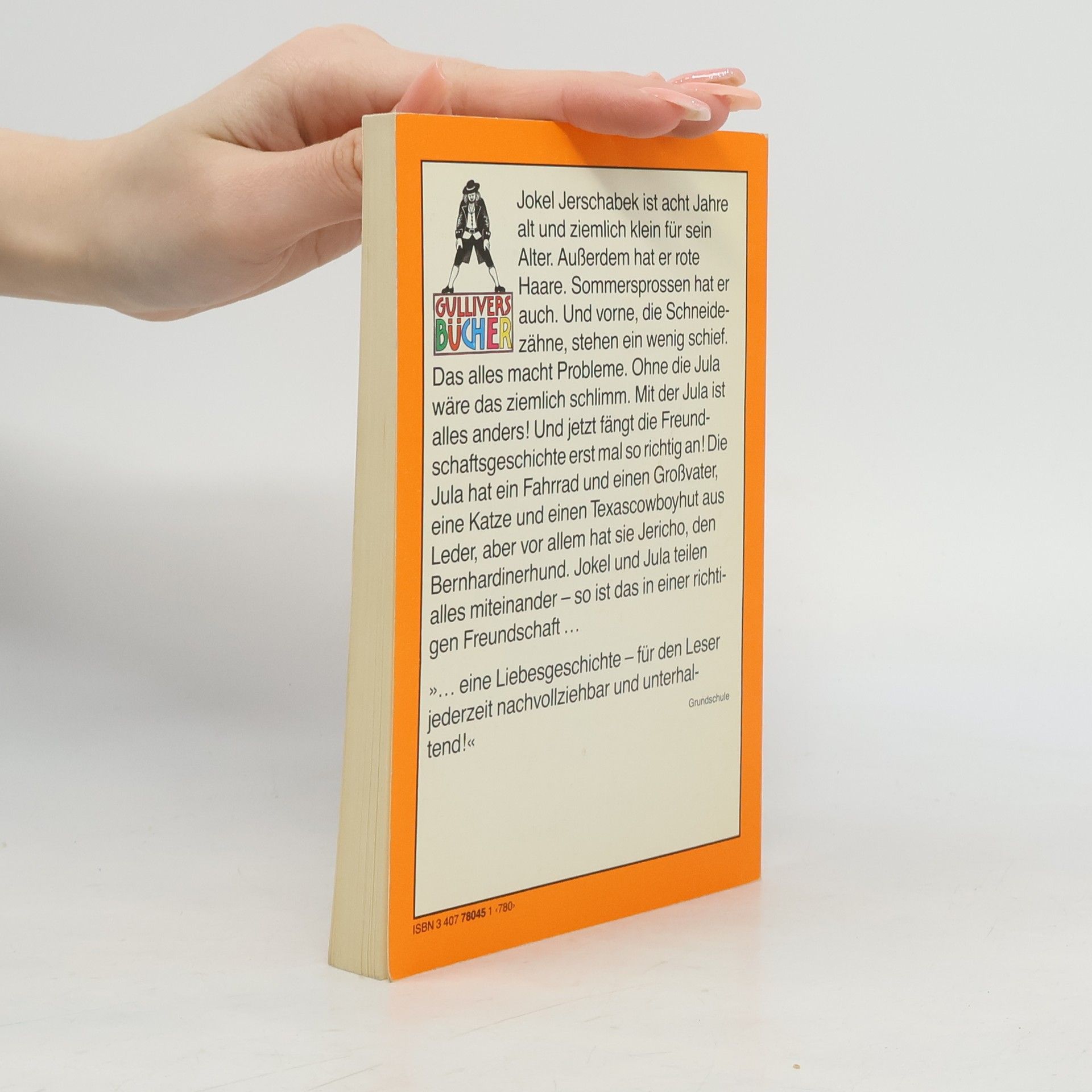 Die Freundschaftsgeschichte vom Jokel mit den Sommersprossen, von Jula mit dem Fahrrad und vom Bernhardiner Jericho. Jokel Jerschabek ist acht Jahre alt und ziemlich klein für sein Alter. Außerdem hat er rote Haare, Sommersprossen und schiefe Schneidezähne. Das alles macht Probleme - und wäre ohne die Jula ziemlich schlimm. Die Jula hat ein Fahrrad und einen Großvater, eine Katze, einen echten Texascowboyhut aus Leder, und vor allem hat sie einen Bernhardinerhund, den Jericho. Jula und Jokel teilen alles miteinander. Das muss bei einer richtigen Freundschaft so sein.