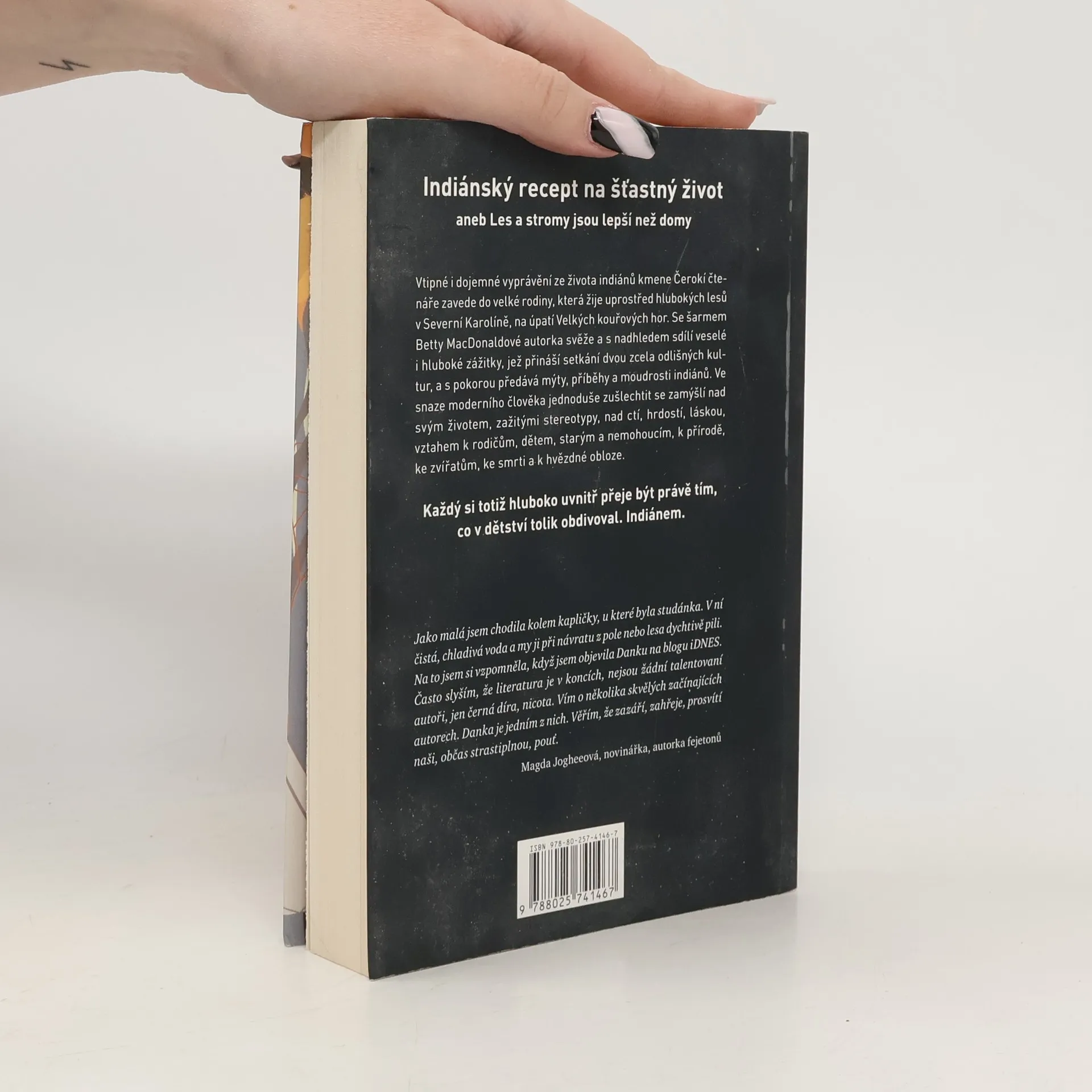 Danka Štoflová, autorka úspěšného blogu na portálu iDNES, představuje knižní podobu vtipně a s nadhledem vyprávěných příběhů ze života indiánů kmene Čerokí o velké rodině, muži a dětech, společně žijících na půdě, která indiánům po staletí patří, uprostřed hlubokých lesů v Severní Karolíně, na úpatí pohoří Great Smoky Mountains. Vtipně, svěže a poutavě se šarmem Betty MacDonaldové předává mýty, životní postoje a jednoduché moudrosti okořeněné sžíváním se s naprosto odlišnou, evropskou kulturou v osobě samotné autorky. S pokorou vypráví příběhy indiánů a ve snaze moderního člověka jednoduše zušlechtit se zamýšlí nad svým životem, zažitými stereotypy, nad ctí, hrdostí, láskou, vztahem k rodičům, dětem, starým a nemohoucím, k přírodě, ke zvířatům, ke smrti a k hvězdné obloze.Každý si totiž hluboko uvnitř, přeje být právě tím, co v dětství tolik obdivoval. Indiánem.