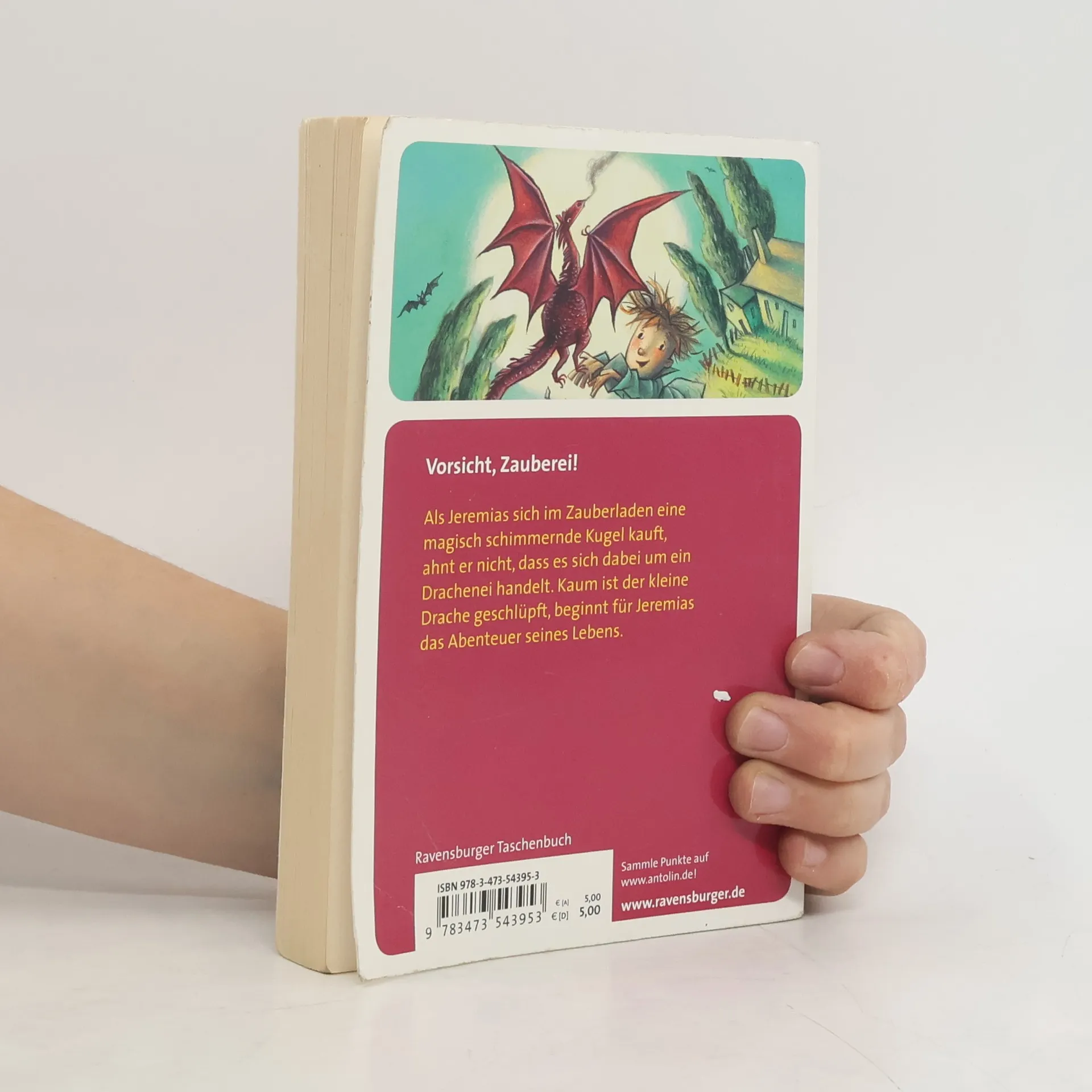 Jeremias kauft eine magisch schimmernde Kugel, die er laut Beschreibung dem Vollmondlicht aussetzen soll. Er staunt nicht schlecht, als aus der Kugel ein Feuer speiendes Drachenbaby schlüpft.