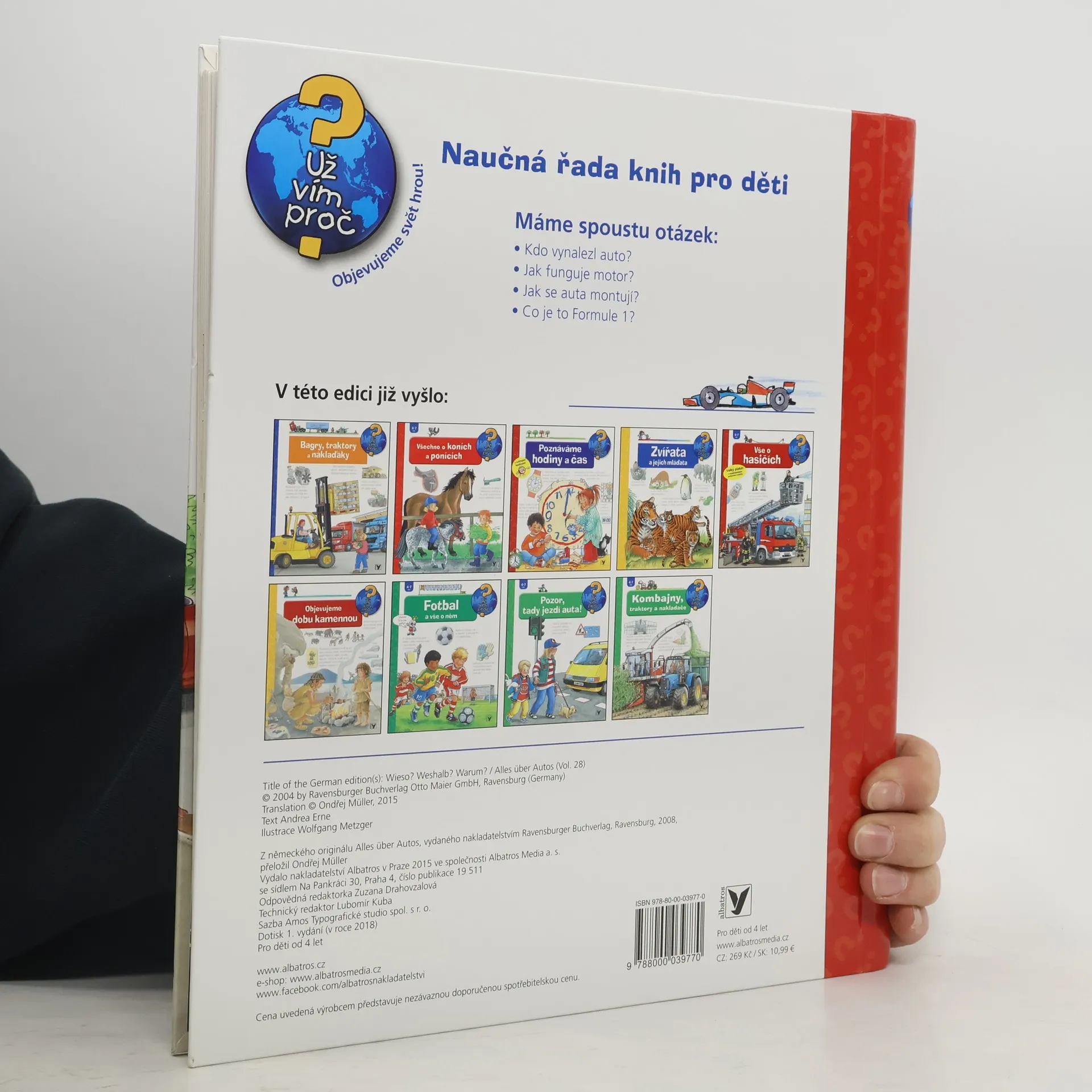 Jak funguje motor? Kdy vzniklo první auto? A jak se auto vlastně vyrábí? Odpovědi na tyto a mnohé další otázky, se kterými si rodiče často nevědí rady, se děti dovědí z obrázkové knihy Vše o autech z oblíbené edice Už vím proč?. Auta jsou nedílnou součastí každodenního života dospělých i dětí. O to zajímavější je vědět, jak takové auto vzníká nebo jak ho správně zabezpečit. Malí i velcí fanoušci aut budou mít možnost podívat se do výrodní haly nebo si vyzkoušet tzv. crashtest. Kniha Vše o autech vysvětluje zábavně a hravě, proces výroby auta od prvního návrhu po hotový vůz. Nechybějí ani kapitoly o historii automobilu nebo o dopravě.