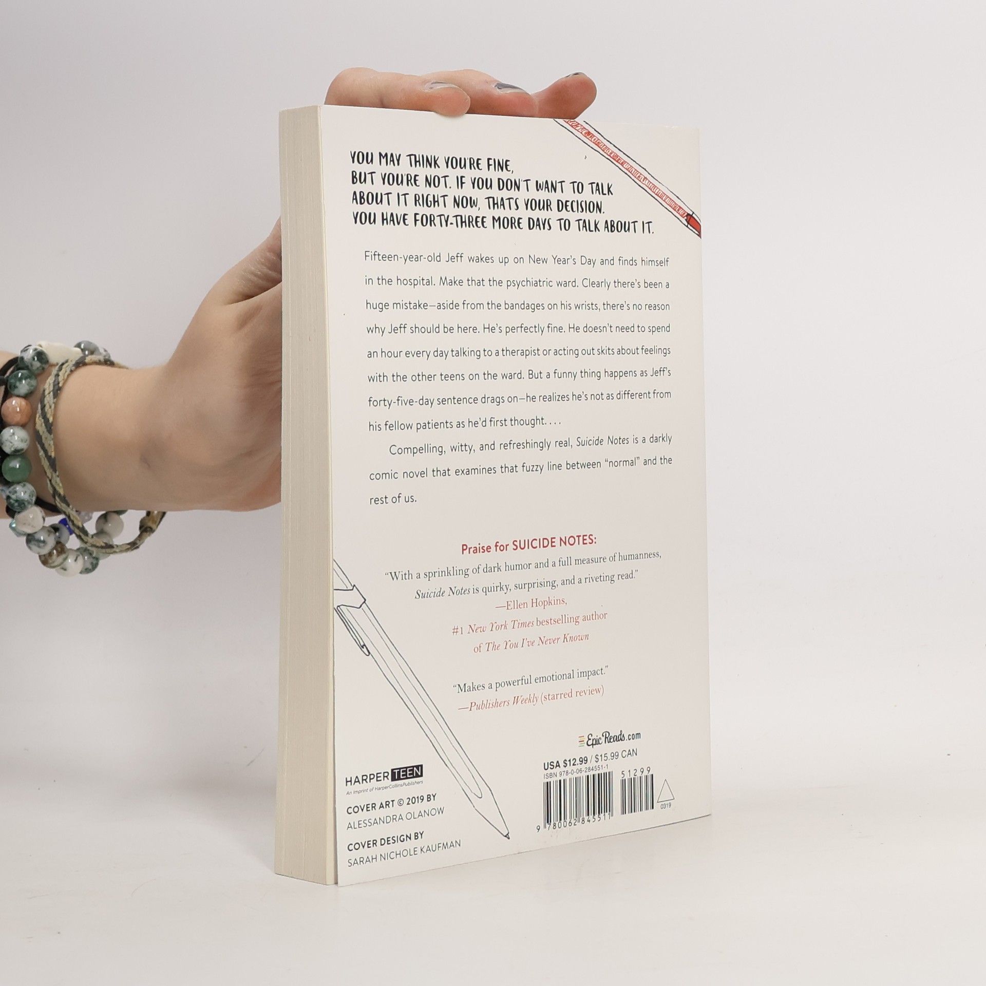 An unforgettable coming of age novel for fans of 13 Reasons Why, It’s Kind of a Funny Story, and The Perks of Being a Wallflower. Fifteen-year-old Jeff wakes up on New Year’s Day to find himself in the hospital—specifically, in the psychiatric ward. Despite the bandages on his wrists, he’s positive this is all some huge mistake. Jeff is perfectly fine, perfectly normal; not like the other kids in the hospital with him. But over the course of the next forty-five days, Jeff begins to understand why he ended up here—and realizes he has more in common with the other kids than he thought. “With a sprinkling of dark humor and a full measure of humanness, Suicide Notes is quirky, surprising, and a riveting read.” —Ellen Hopkins, author of The You I’ve Never Known and Love Lies Beneath “Like the very best teen novels, Suicide Notes is both classic and edgy, timeless and provocative.” —Brent Hartinger, author of Geography Club “Makes a powerful emotional impact.” —Publishers Weekly (starred review) “Jeff’s wit and self-discovery are refreshing, poignant, and, at times, laugh-out-loud funny.” —School Library Journal