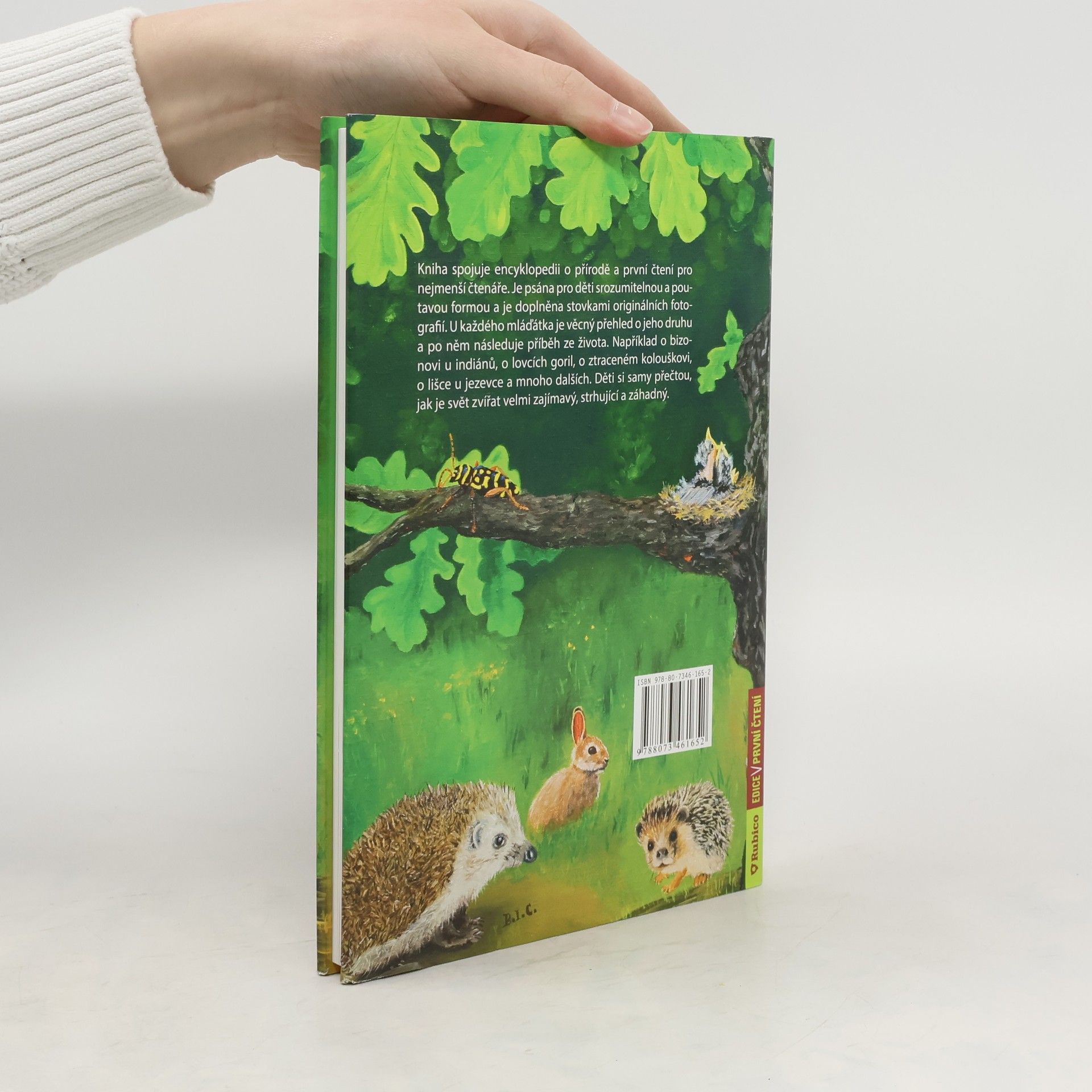 Kniha spojuje encyklopedii o přírodě a první čtení pro nejmenší čtenáře. Je psána pro děti srozumitelnou a poutavou formou a je doplněna stovkami originálních fotografií. U každého mláďátka je věcný přehled o jeho druhu a po něm následuje příběh ze života. Například o bizonovi u indiánů, o lovcích goril, o ztraceném kolouškovi, o lišce u jezevce a mnoho dalších. Děti si samy přečtou, jak je svět zvířat velmi zajímavý, strhující a záhadný.