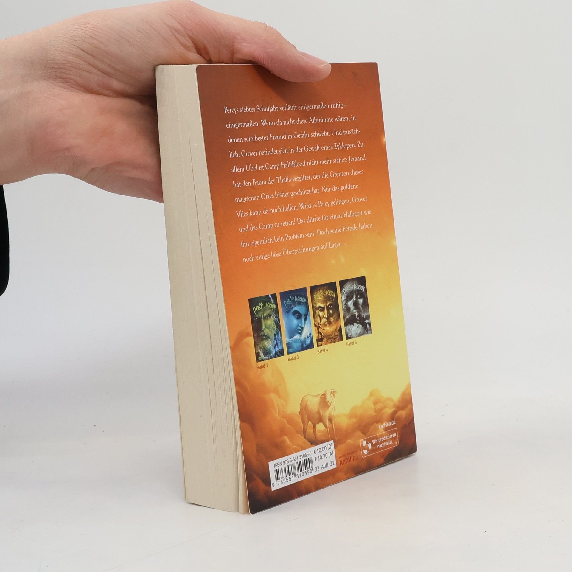 Auch Percys siebtes Schuljahr verläuft nicht wirklich ruhig: Erst gerät sein bester Freund Grover in die Gewalt eines Zyklopen, dann vergiftet jemand den Baum der Thalia im Camp der Halbgötter und hebt so dessen magische Kräfte auf. Nur das goldene Vlies kann jetzt noch helfen. Das aufzutreiben ist allerdings weitaus schwieriger als Percy gedacht hat - ein abenteuerlicher Wettlauf um das Leben Grovers und die Sicherheit des Camps beginnt.