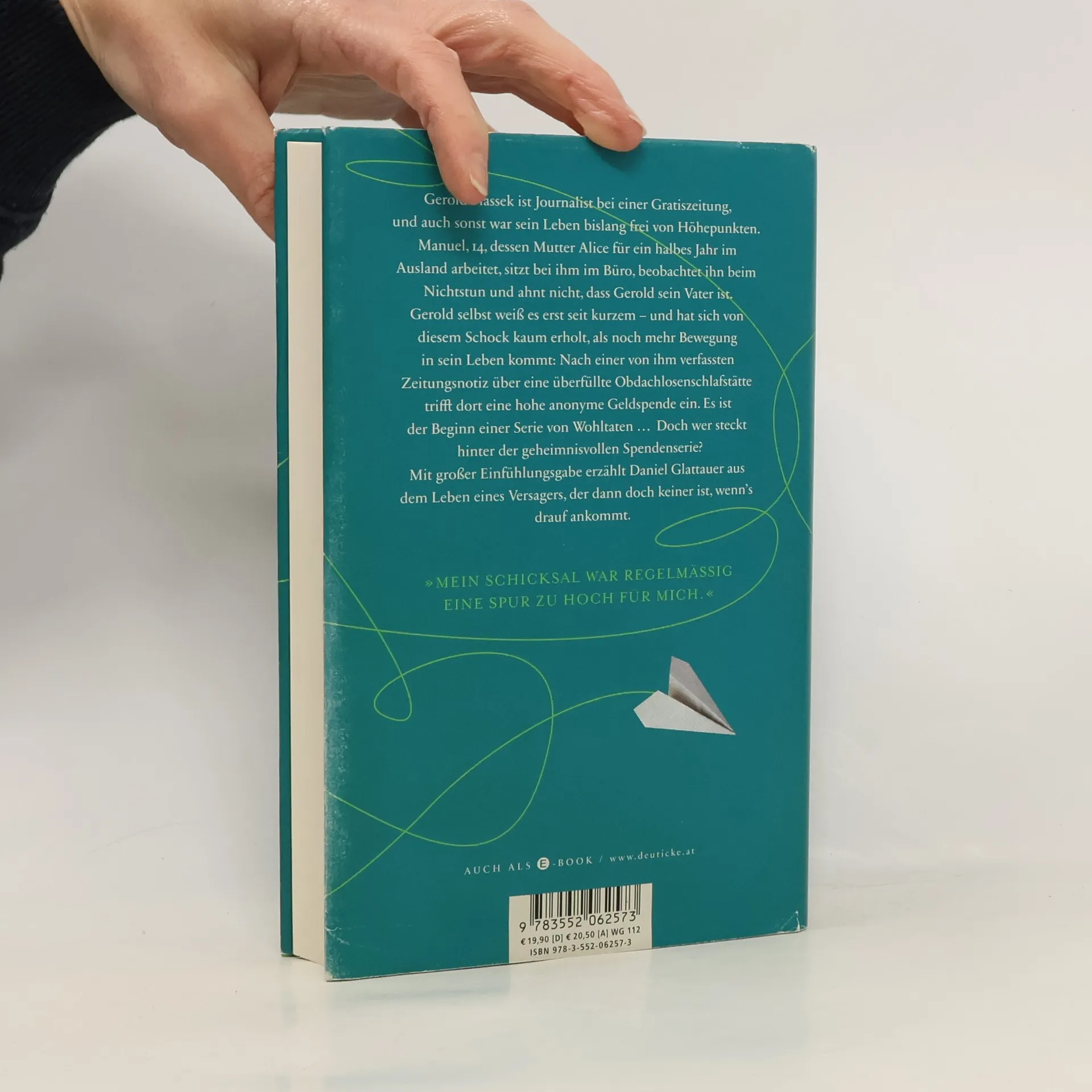 Gerold Plassek ist Journalist bei einer Gratiszeitung. Bei ihm im Büro sitzt der 14-jährige Manuel, dessen Mutter im Ausland arbeitet. Er beobachtet Gerold beim Nichtstun und ahnt nicht, dass dieser Versager sein Vater ist. Gerold fehlt jeder Antrieb, die Stammkneipe ist sein Wohnzimmer und der Alkohol sein verlässlichster Freund. Plötzlich kommt Bewegung in sein Leben: Nach dem Erscheinen seines Artikels über eine überfüllte Obdachlosenschlafstätte trifft dort eine anonyme Geldspende ein. Das ist der Beginn einer Serie von Wohltaten, durch die Gerold immer mehr in den Blickpunkt der Öffentlichkeit rückt. Und langsam beginnt auch Manuel, ihn zu mögen ... - Ein so spannender wie anrührender Roman, der auf einer wahren Begebenheit beruht.