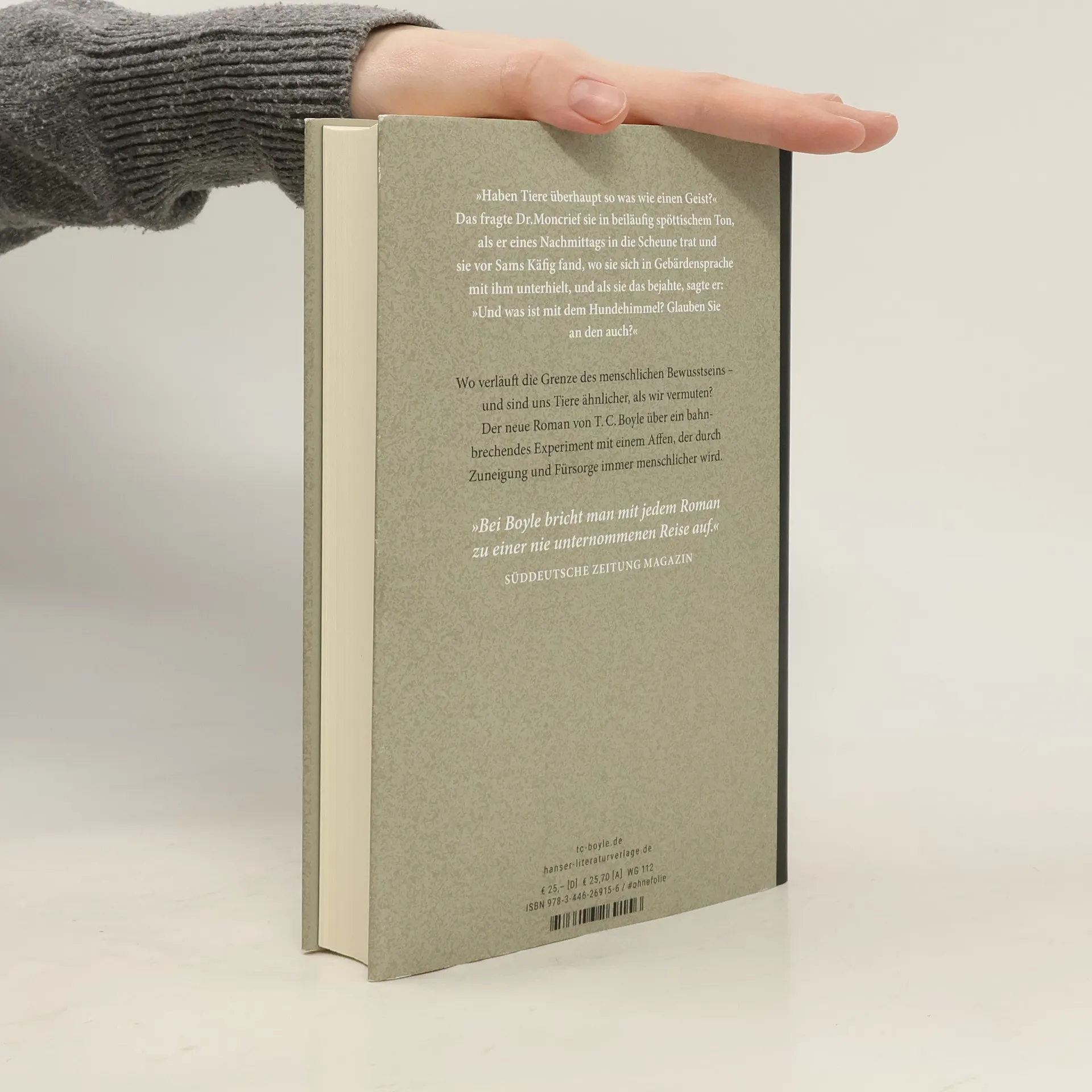 Wer ist menschlicher? Der Mensch oder der Affe? - „Wohl einer von Boyles besten – und traurigsten – Romanen, ein Buch, das die Grenzen zwischen Mensch und Tier auflöst.“ Irene Binal, Neue Zürcher Zeitung Sam, der Schimpanse, den Professor Schermerhorn in eine TV-Show bringt, kann in der Gebärdensprache nicht nur einen Cheeseburger bestellen, sondern auch seinen Namen sagen. Wie ein Kind wächst er umsorgt von Wissenschaftlern auf. Als die schüchterne Aimee dazu stößt, entspinnt sich eine einzigartige Beziehung: Sam erwidert ihre Gefühle und entwickelt sich regelrecht zu einem Individuum. Als jedoch die Vision Schermerhorns, der an das Menschliche im Tier glaubt, keine Schule macht, wird er für Tierexperimente von einer anderen Universität beschlagnahmt. Aimee ist am Boden zerstört und fasst einen verrückten Plan. T. C. Boyle geht ebenso komisch wie mitfühlend der Frage nach, ob uns Tiere ähnlicher sind, als wir vermuten.