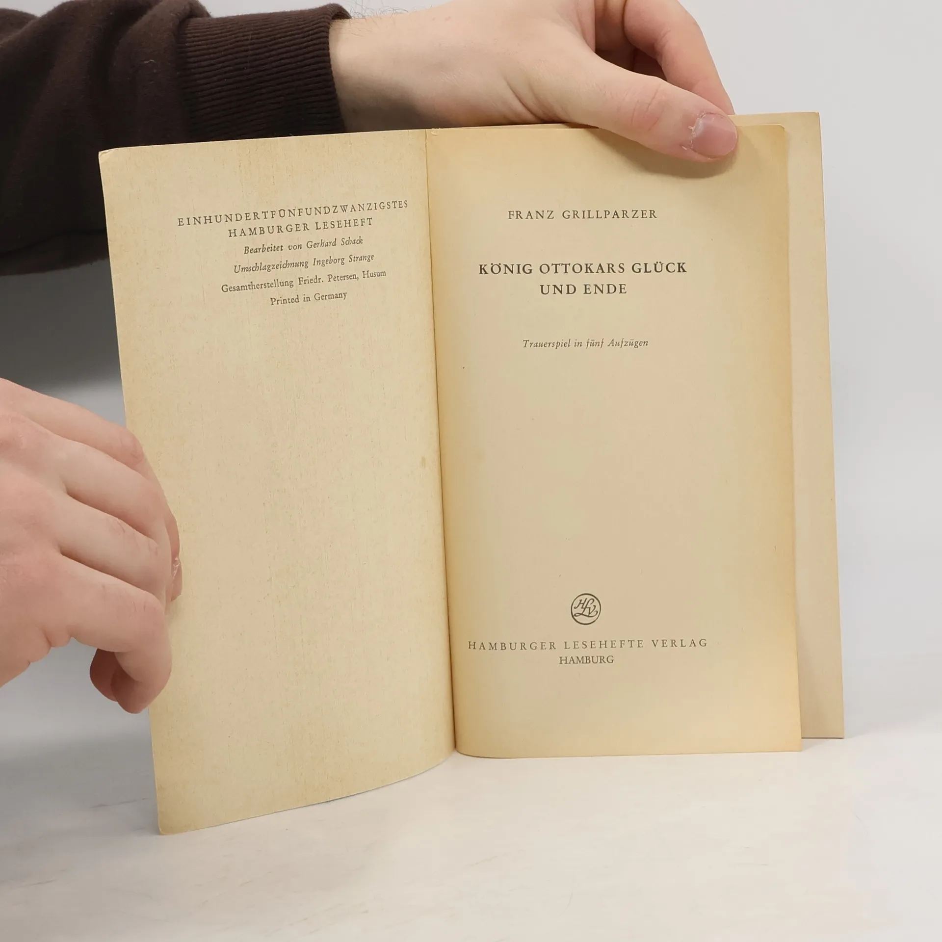 Franz Grillparzer: König Ottokars Glück und Ende. Trauerspiel in fünf Aufzügen Entstanden 1823. Erstdruck: Wien (Wallishauser) 1825. Uraufführung am 19.2.1825 in Wien. Vollständige Neuausgabe mit einer Biographie des Autors. Herausgegeben von Karl-Maria Guth. Berlin 2015, 2. Auflage. Textgrundlage ist die Ausgabe: Franz Grillparzer: Sämtliche Werke. Ausgewählte Briefe, Gespräche, Berichte. Herausgegeben von Peter Frank und Karl Pörnbacher, München: Hanser, [1960–1965]. Die Paginierung obiger Ausgabe wird in dieser Neuausgabe als Marginalie zeilengenau mitgeführt. Umschlaggestaltung von Thomas Schultz-Overhage unter Verwendung des Bildes: Alfons Mucha, König Premysl Ottokar II. Der Bund der slawischen Dynastien, 1924. Gesetzt aus Minion Pro, 11 pt.