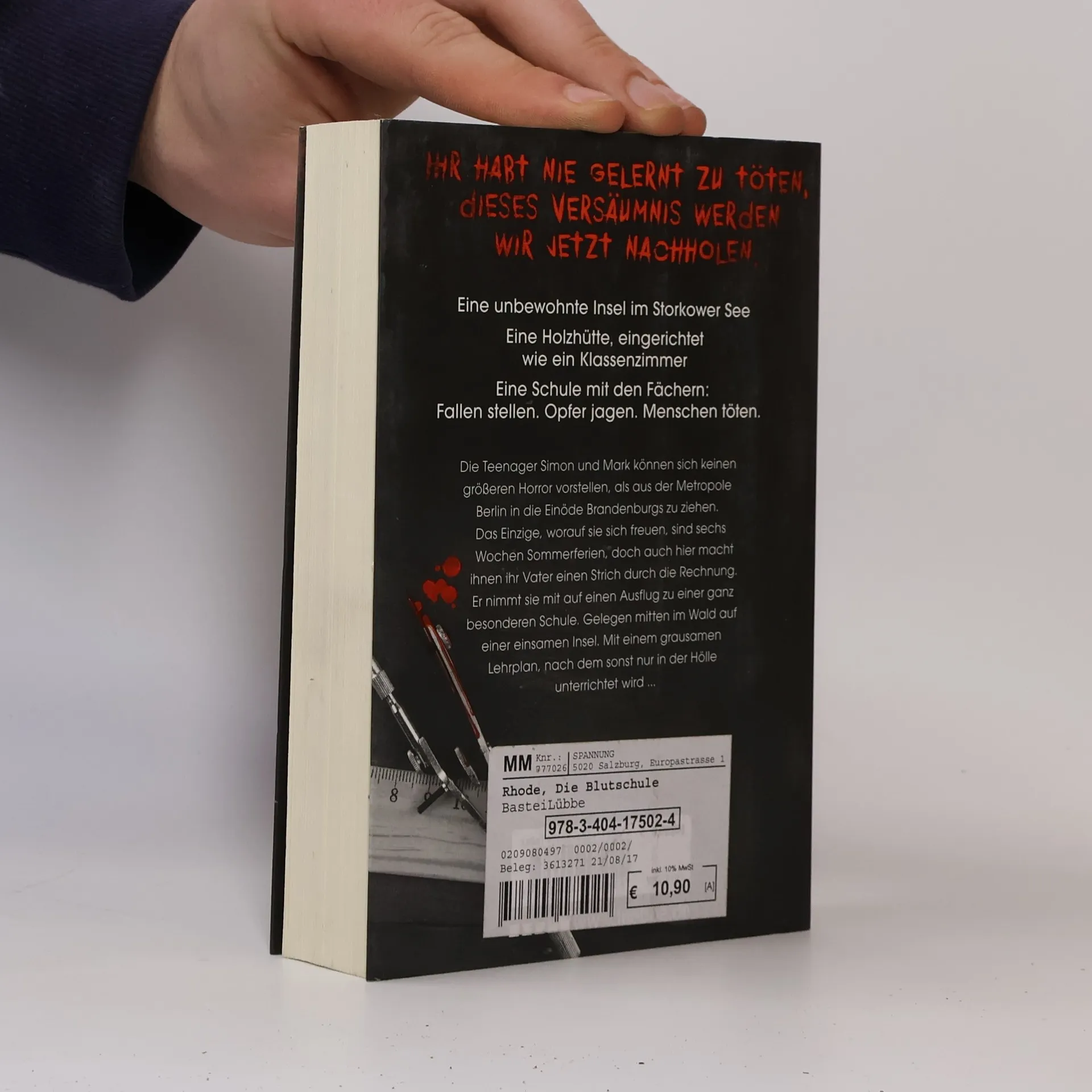 Eine unbewohnte Insel im Storkower See Eine Holzhütte, eingerichtet wie ein Klassenzimmer Eine Schule mit den Fächern: Fallen stellen. Opfer jagen. Menschen töten. Die Teenager Simon und Mark können sich keinen größeren Horror vorstellen, als aus der Metropole Berlin in die Einöde Brandenburgs zu ziehen. Das Einzige, worauf sie sich freuen, sind sechs Wochen Sommerferien, doch auch hier macht ihnen ihr Vater einen Strich durch die Rechnung. Er nimmt sie mit auf einen Ausflug zu einer ganz besonderen Schule. Gelegen mitten im Wald auf einer einsamen Insel. Mit einem grausamen Lehrplan, nach dem sonst nur in der Hölle unterrichtet wird ...