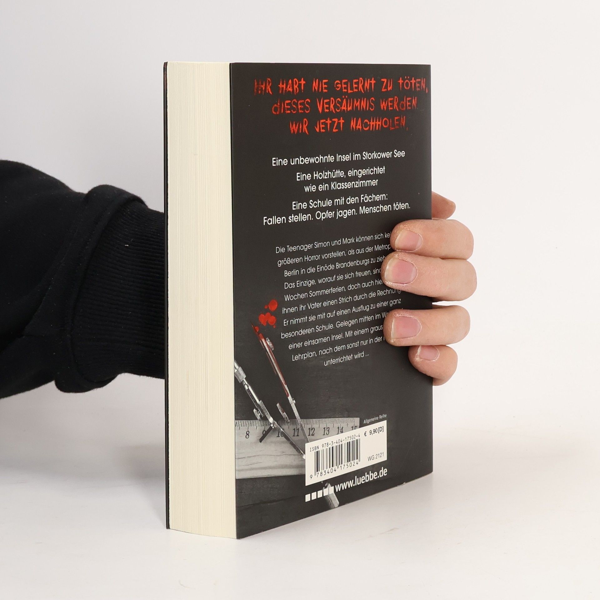 Eine unbewohnte Insel im Storkower See Eine Holzhütte, eingerichtet wie ein Klassenzimmer Eine Schule mit den Fächern: Fallen stellen. Opfer jagen. Menschen töten. Die Teenager Simon und Mark können sich keinen größeren Horror vorstellen, als aus der Metropole Berlin in die Einöde Brandenburgs zu ziehen. Das Einzige, worauf sie sich freuen, sind sechs Wochen Sommerferien, doch auch hier macht ihnen ihr Vater einen Strich durch die Rechnung. Er nimmt sie mit auf einen Ausflug zu einer ganz besonderen Schule. Gelegen mitten im Wald auf einer einsamen Insel. Mit einem grausamen Lehrplan, nach dem sonst nur in der Hölle unterrichtet wird ...