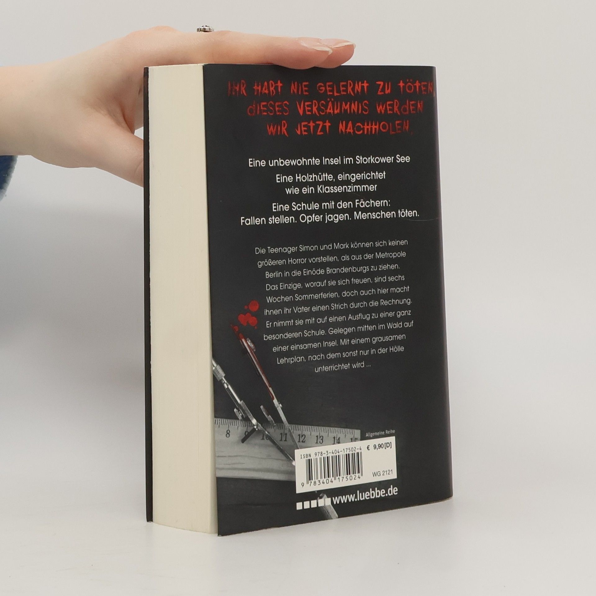 Eine unbewohnte Insel im Storkower See Eine Holzhütte, eingerichtet wie ein Klassenzimmer Eine Schule mit den Fächern: Fallen stellen. Opfer jagen. Menschen töten. Die Teenager Simon und Mark können sich keinen größeren Horror vorstellen, als aus der Metropole Berlin in die Einöde Brandenburgs zu ziehen. Das Einzige, worauf sie sich freuen, sind sechs Wochen Sommerferien, doch auch hier macht ihnen ihr Vater einen Strich durch die Rechnung. Er nimmt sie mit auf einen Ausflug zu einer ganz besonderen Schule. Gelegen mitten im Wald auf einer einsamen Insel. Mit einem grausamen Lehrplan, nach dem sonst nur in der Hölle unterrichtet wird ...