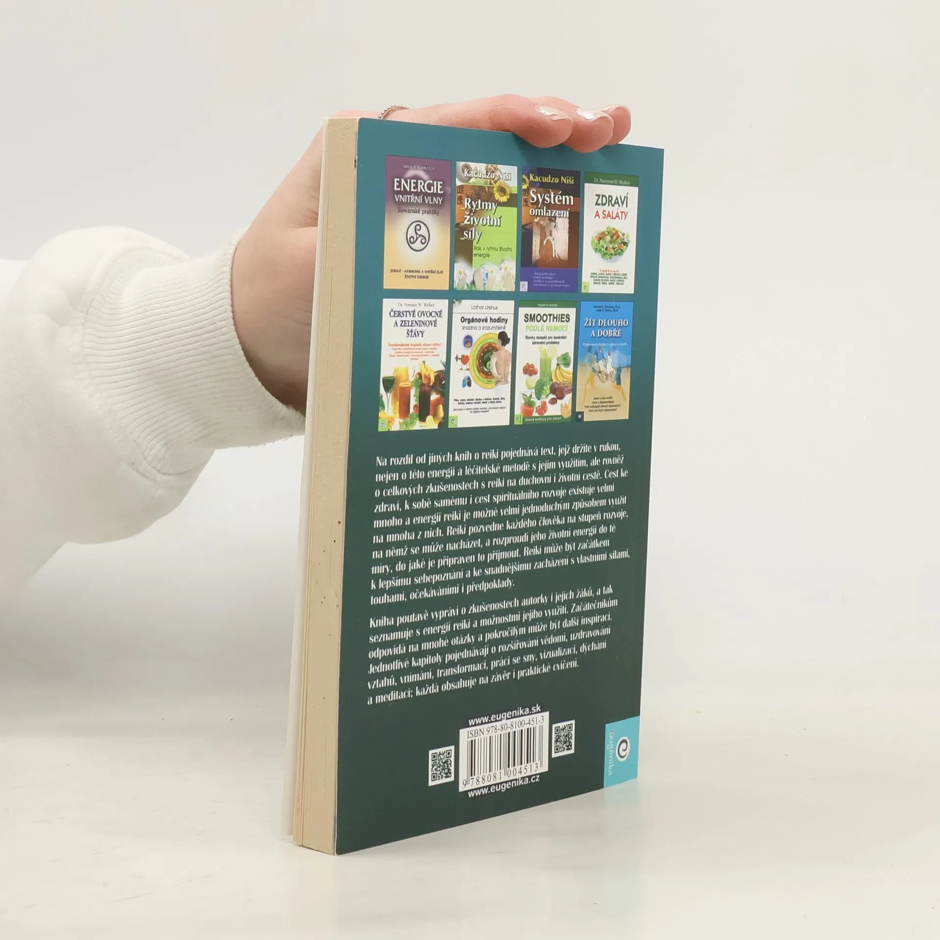 Na rozdíl od jiných knih o reiki pojednává text, jejž držíte v rukou, nejen o této energii a léčitelské metodě s jejím využitím, ale rovněž o celkových zkušenostech s reiki na duchovní i životní cestě. Cest ke zdraví, k sobě samému i cest spirituálního rozvoje existuje velmi mnoho a energii reiki je možné velmi jednoduchým způsobem využít na mnoha z nich. Reiki pozvedne každého člověka na stupeň rozvoje, na němž se může nacházet, a rozproudí jeho životní energii do té míry, do jaké je připraven to přijmout. Reiki může být začátkem k lepšímu sebepoznání a ke snadnějšímu zacházení s vlastními silami, touhami, očekáváními i předpoklady. Kniha poutavě vypráví o zkušenostech autorky i jejích žáků, a tak seznamuje s energií reiki a možnostmi jejího využití. Začátečníkům odpovídá na mnohé otázky a pokročilým může být další inspirací. Jednotlivé kapitoly pojednávají o rozšiřování vědomí, uzdravování vztahů, vnímání, transformaci, práci se sny, vizualizaci, dýchání a meditaci; každá obsahuje na závěr i praktické cvičení.