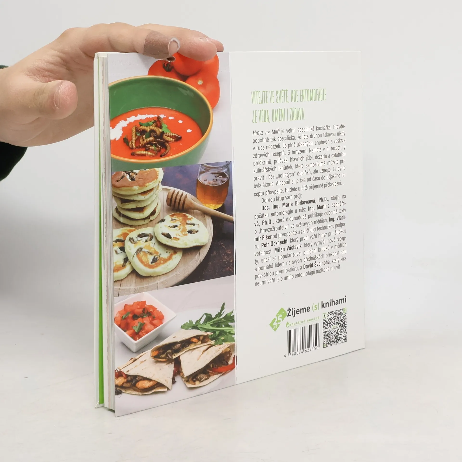 Vítejte ve světě, kde entomofágie je věda, umění i zábava. Hmyz na talíři je velmi specifická kuchařka. Pravděpodobně tak specifická, že jste druhou takovou nikdy v ruce nedrželi. Je plná úžasných, chutných a veskrze zdravých receptů. S hmyzem. Najdete v ní receptury předkrmů, polévek, hlavních jídel, dezertů a ostatních kulinářských lahůdek, které samozřejmě můžete připravit i bez „nohatých“ doplňků, ale uznejte, že by to byla škoda. Alespoň si je čas od času do nějakého receptu přisypejte. Budete určitě příjemně překvapeni… Pojem entomofágie se od přelomu století rozšířil do povědomí mnoha lidí, zájem o recepty a konzumaci hmyzu neustále roste a přání potenciálních konzumentů hmyzu vyústilo v sepsání kuchařky Hmyz na talíři. Najdete v ní odpovědi na otázky, proč jíme hmyz, trochu teorie o tom, jak pracuje lidské tělo, povídání o hmyzu, provedeme vás cestou kolem světa a dozvíte se také, jak hmyz připravovat k vaření. Celý autorský kolektiv přeje pěkné počtení a dobrou chuť!