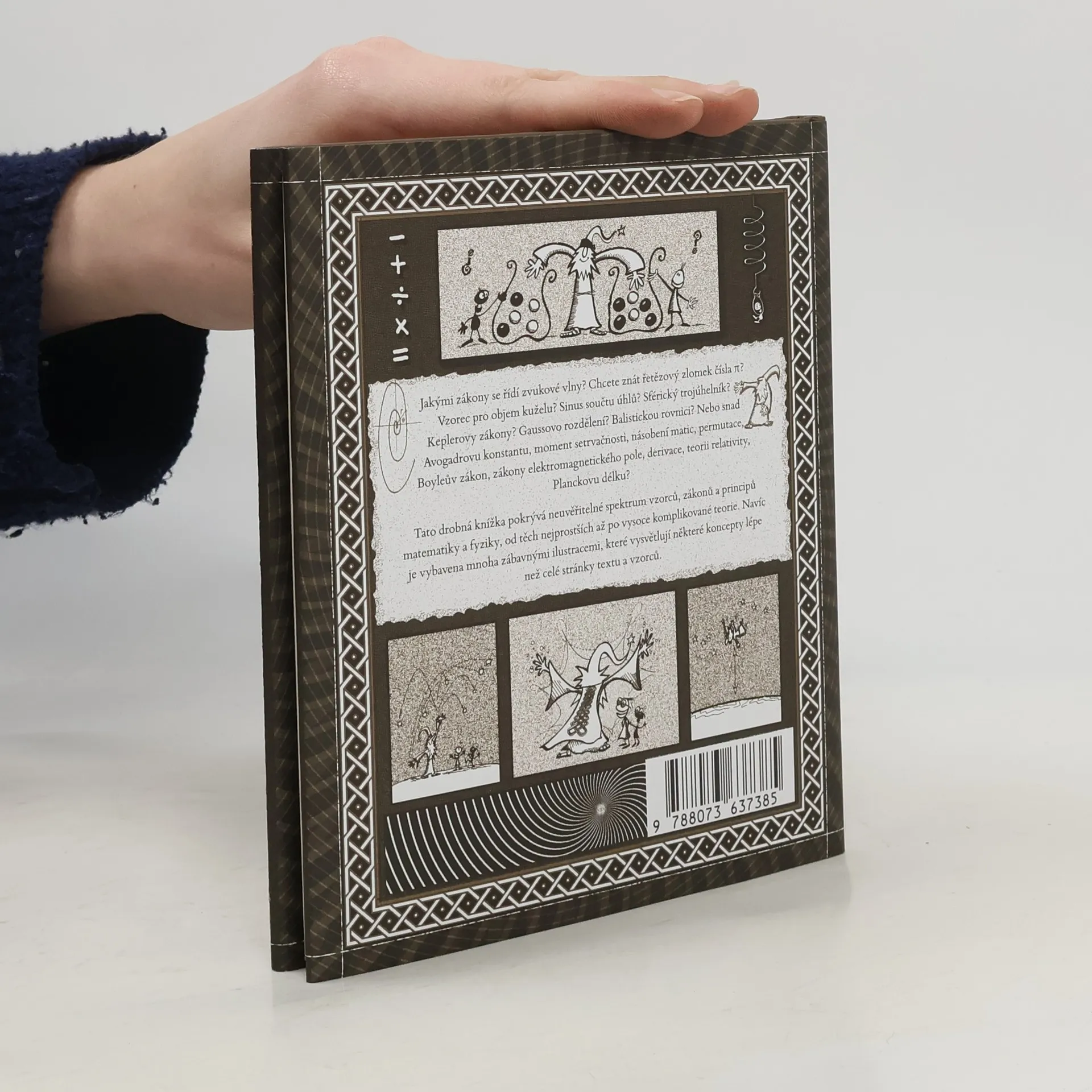V této útlé a půvabné knize shrnují matematik Matthew Watkins a ilustrátor Matt Tweed základní vzorce z matematiky a fyziky v sympatické a snadno pochopitelné podobě. Pokud byste si rádi osvěžili trigonometrii, gravitační zákony, teorii relativity, něco ze statistiky nebo matematické analýzy a řady dalších oborů, jste na správné adrese. Jestli takovou potřebu nemáte, jen zalistujte a potěšte se největšími výtvory lidského ducha za poslední 3 tisíciletí v hutné podobě rovnic, které jsou esteticky působivé samy o sobě, a vtipné kresby tuto jejich vlastnost jen zdůrazňují. Kniha je kompaktní sbírkou formulí a základních pojmů z matematiky a fyziky, která vám pomůže rychle se zorientovat i v problémech, o nichž jste dosud neměli ani tušení.