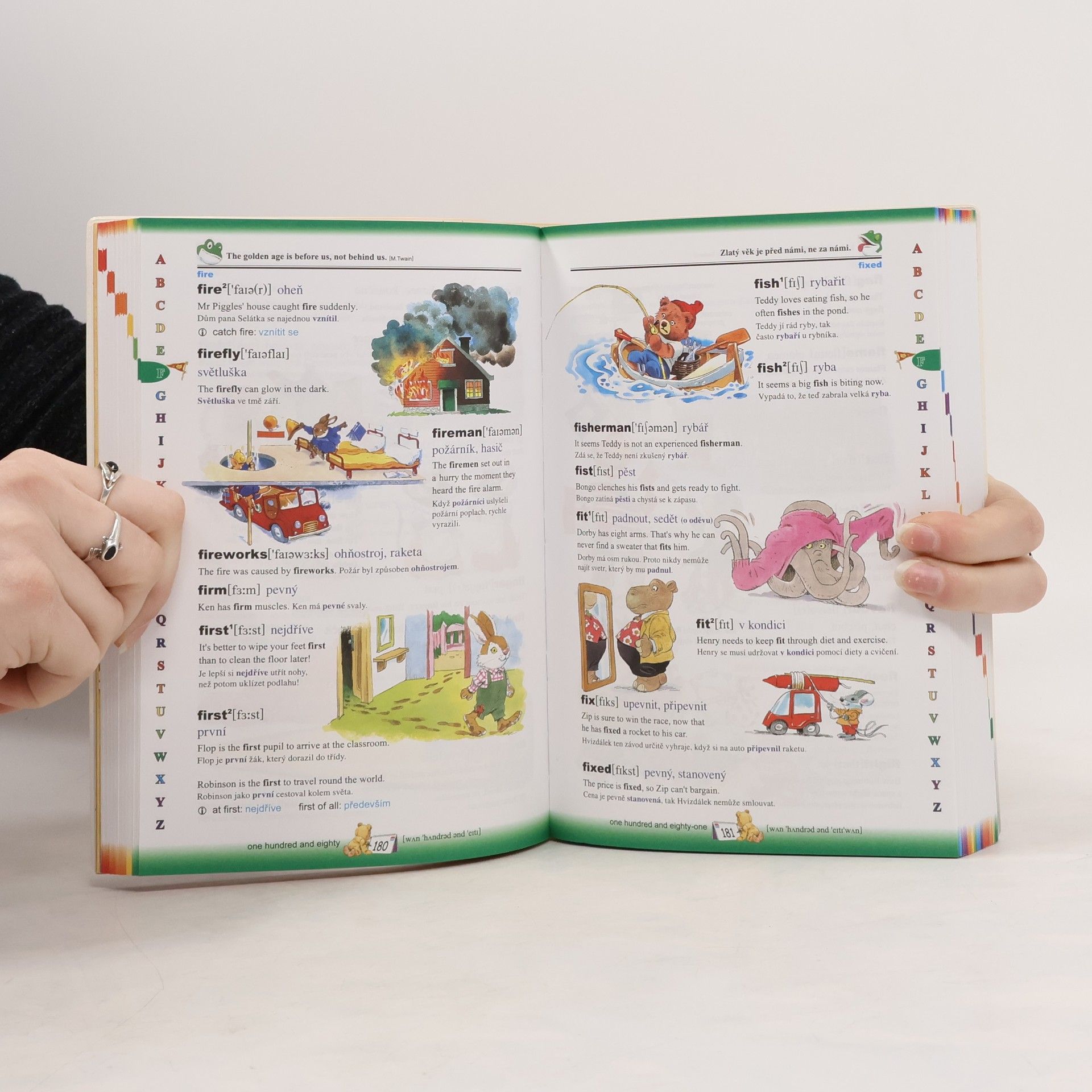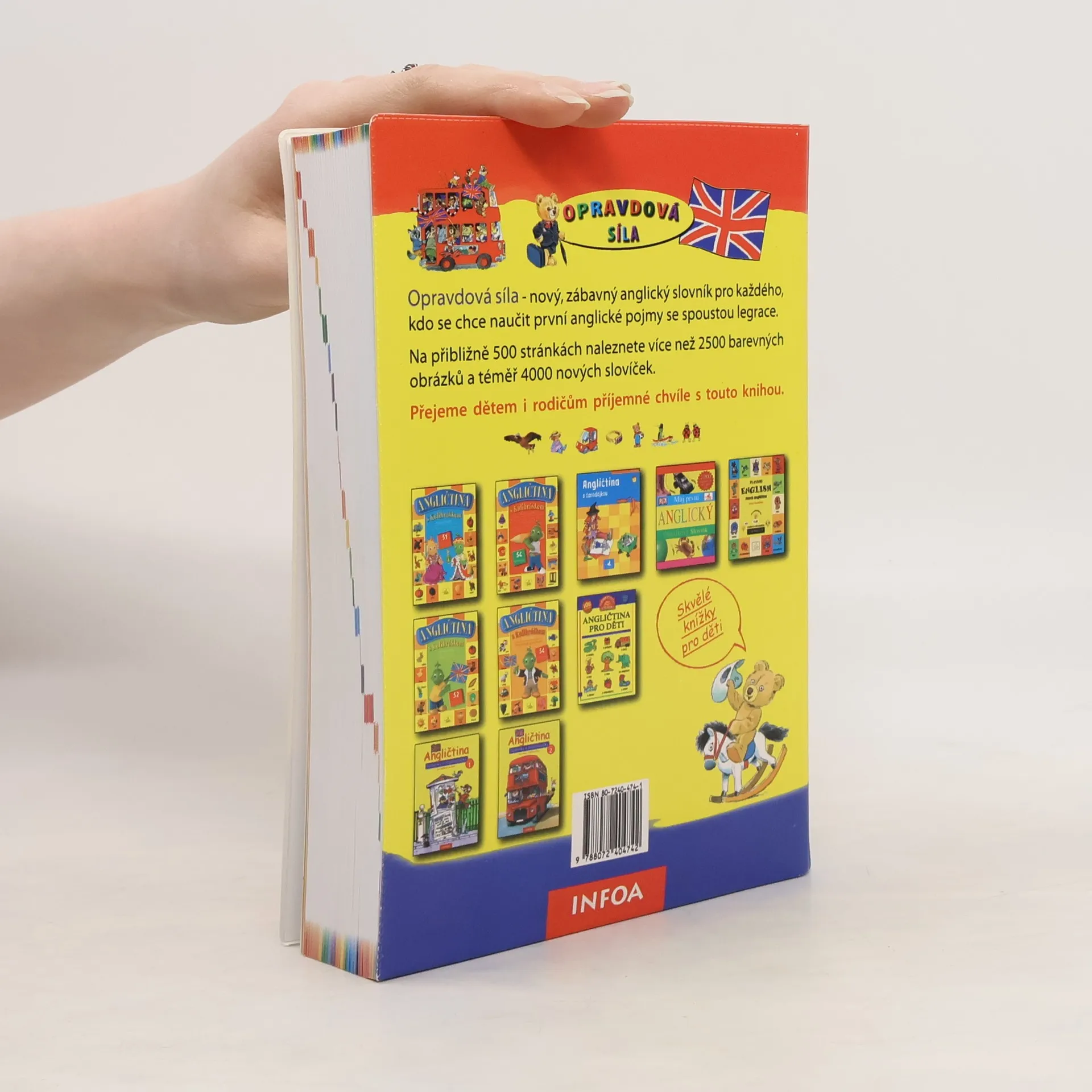 Obsáhlý ilustrovaný slovník pro děti, obsahuje příkladové věty s překladem ke každému slovíčku, výslovnost a přehled nepravidelných sloves. (více než 2500 barevných obrázků a cca 4000 slovíček).