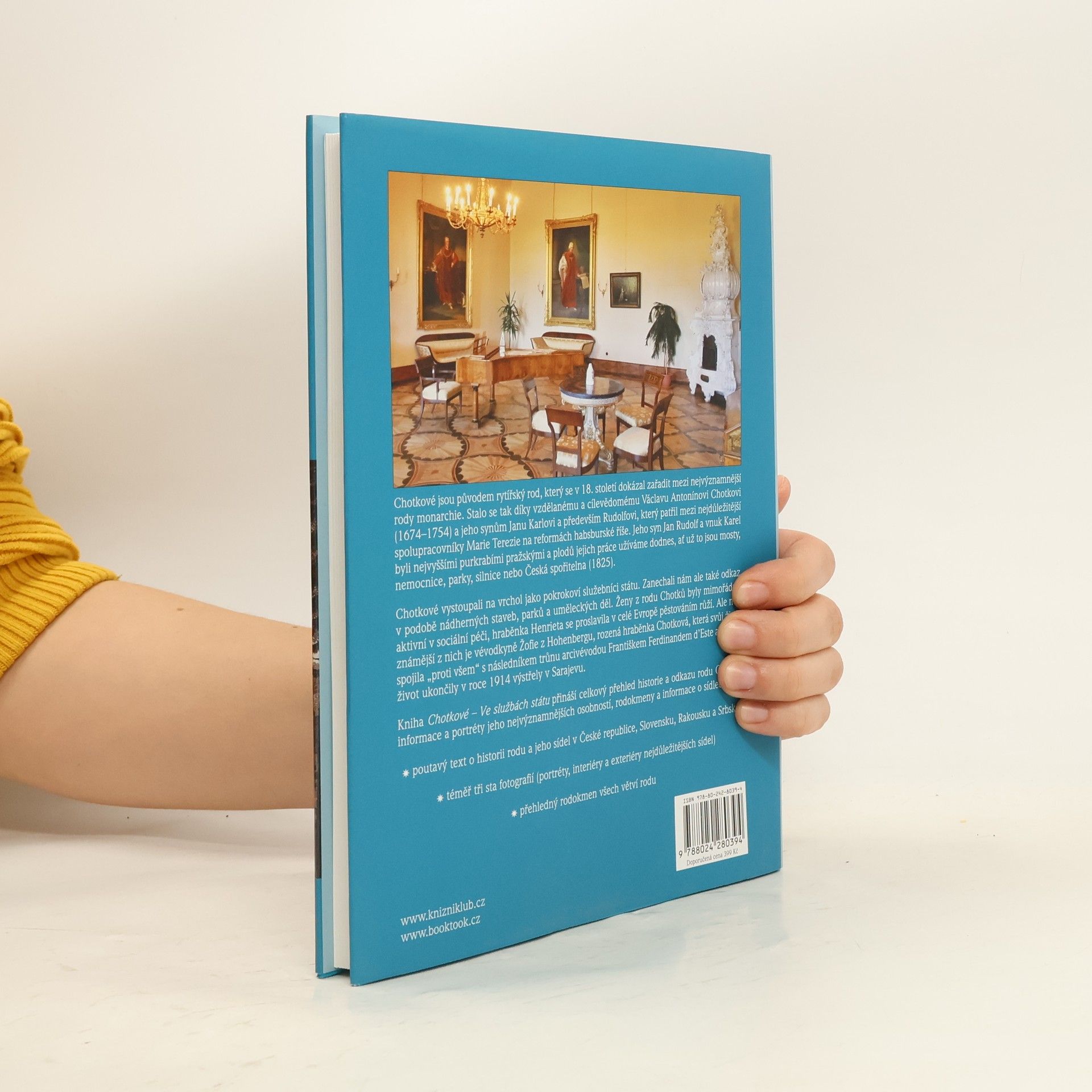 Unikátní obrazová publikace Chotkové – ve službách státu nás seznámí s tímto významným staročeským šlechtickým rodem, který se díky Václavu Antonínovi Chotkovi (1674–1754) dostal mezi politicky nejvýznamnější rody říše. Jeho synové se stali předními spolutvůrci reforem Marie Terezie. Karel Chotek (1783–1868) byl nejvyšším purkrabím pražským a nechal zde vybudoval první nábřeží a druhý most přes Vltavu. Podporoval budování železnic, cest, škol a nemocnic. V roce 1945 byl majetek Chotků zkonfiskován a členové rodiny byli odsunuti. Historie Chotků se uzavřela v roce 1970 úmrtím posledního člena rodu.